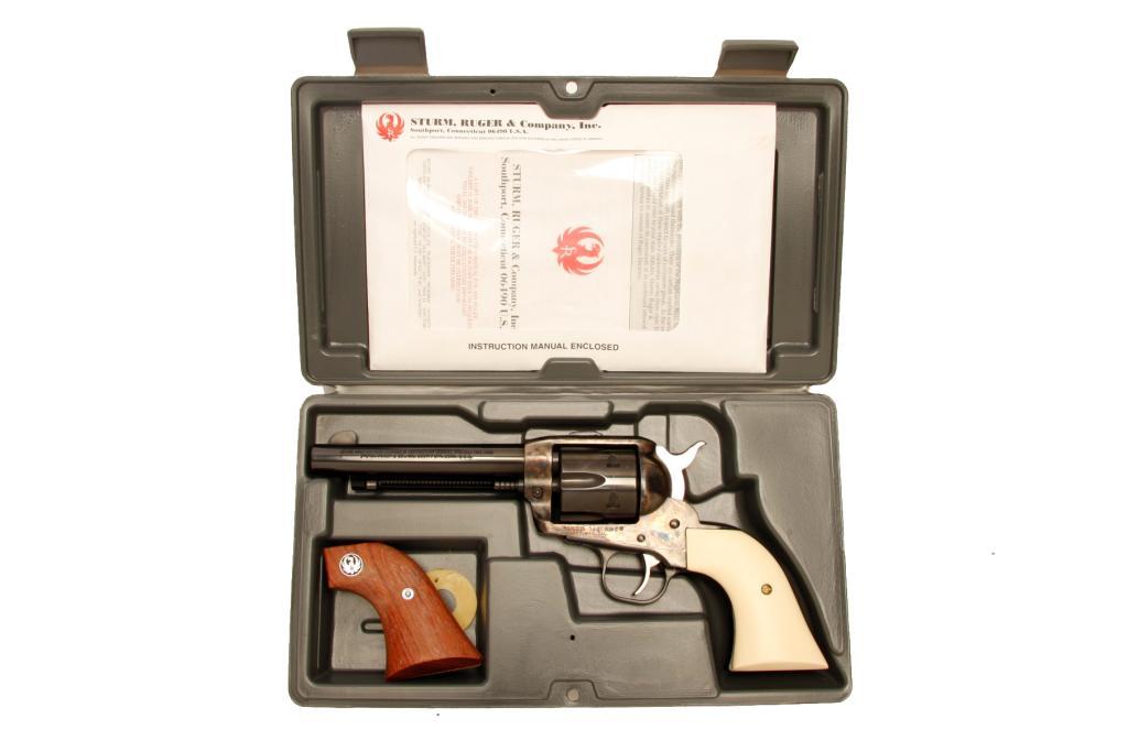 Ruger Vaquero Cal .357 SN:56-77419 Single action Frontier style 6 shot revolver. Blued finish, case color frame, simulated ivory grips (original wood grips included), 5 1/2" barrel, good bore and action: Condition: Little use, minimal drag line on cylinder. In original grey carry case with instruction manual.