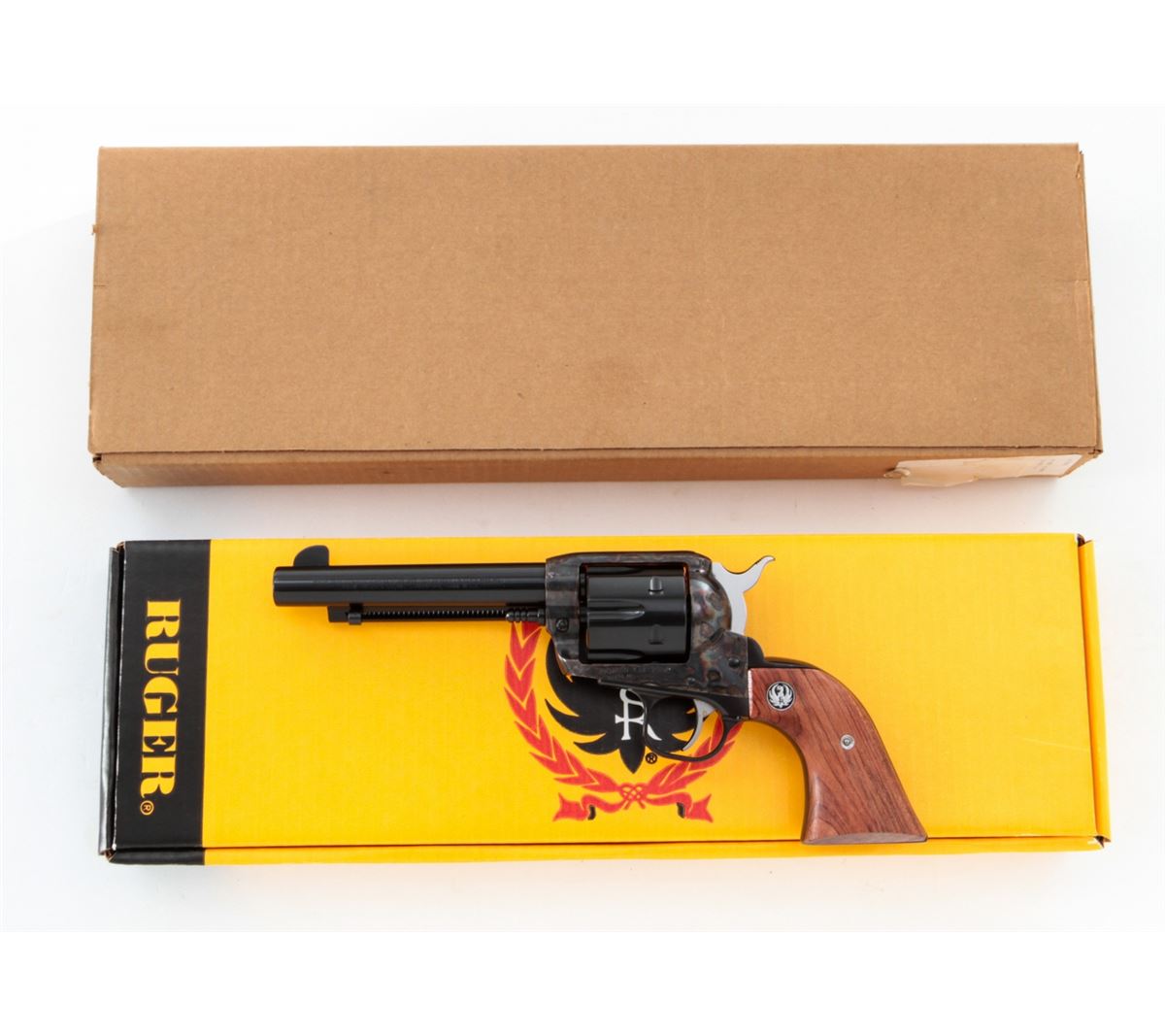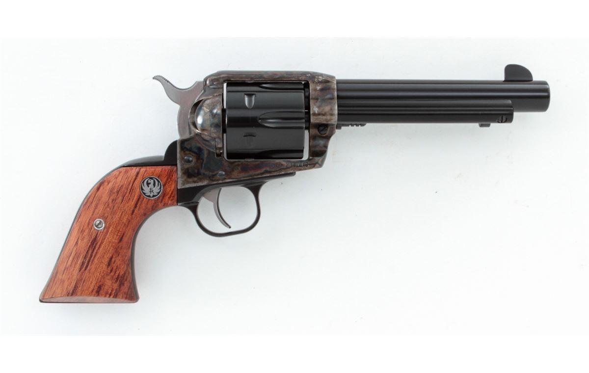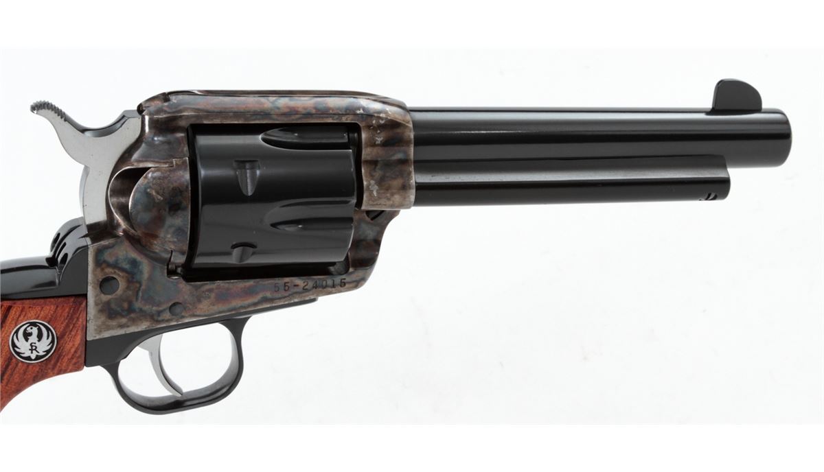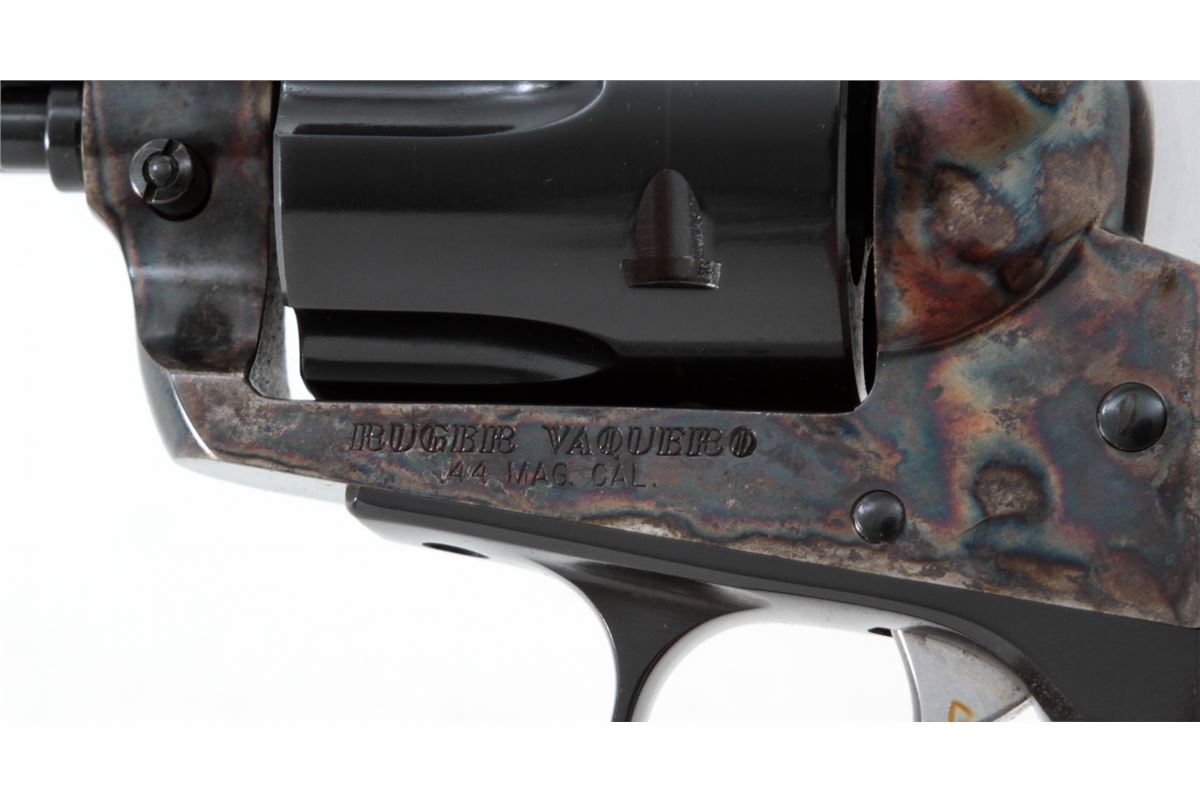 Ruger Vaquero Single Action Revolver, #55-24015, .44 mag. cal., 5-1/2'' barrel, blue finish, case hardened frame, smooth rosewood grips with inlaid Ruger medallions, in original box with matching end label. Condition is excellent with index line, light overall marks from handling, and several small losses to the case hardened finish near barrel. Action is crisp, bore is bright. Est.: $400-$550. (Modern/PPT)