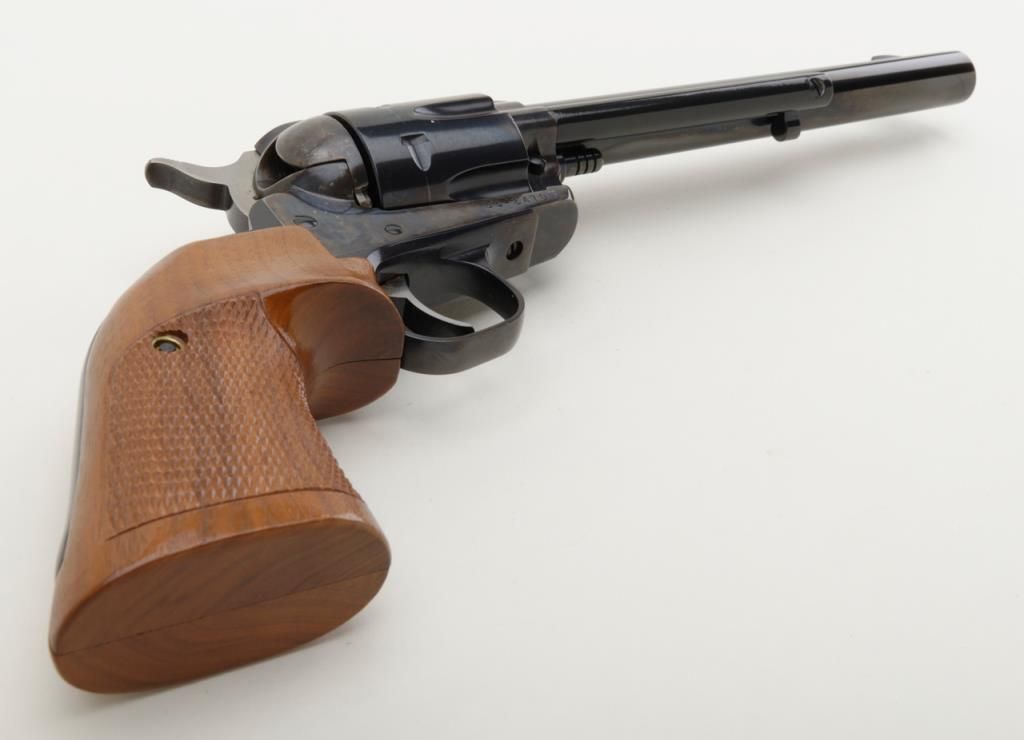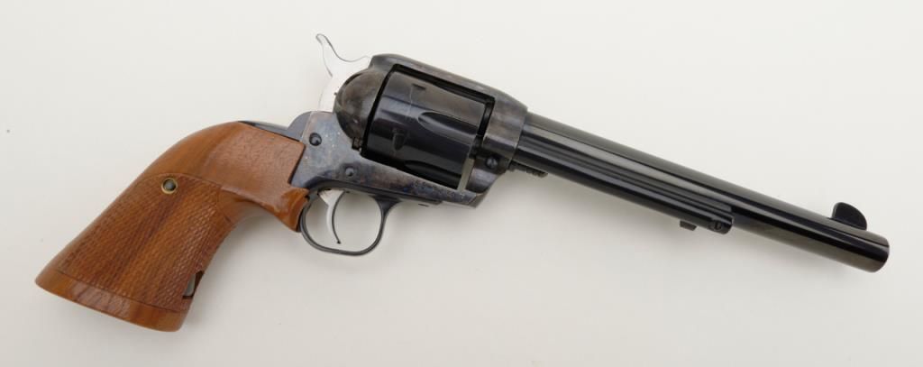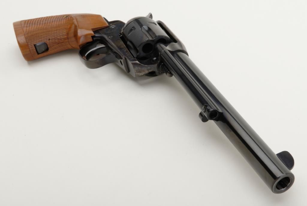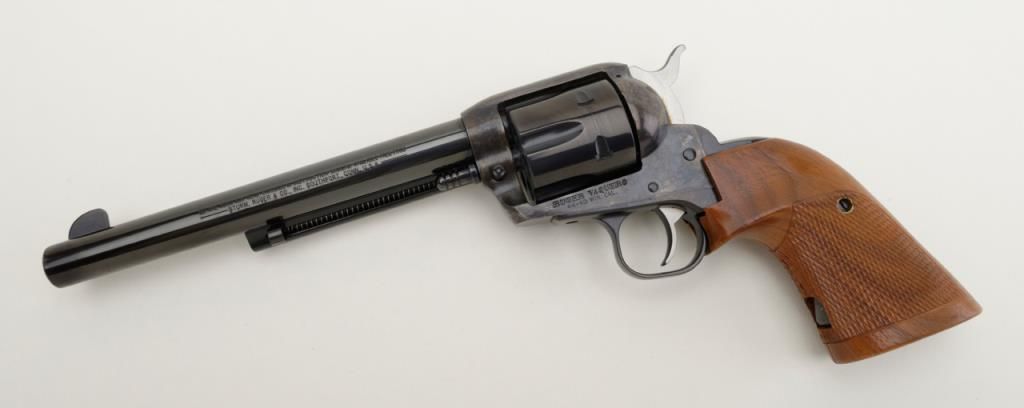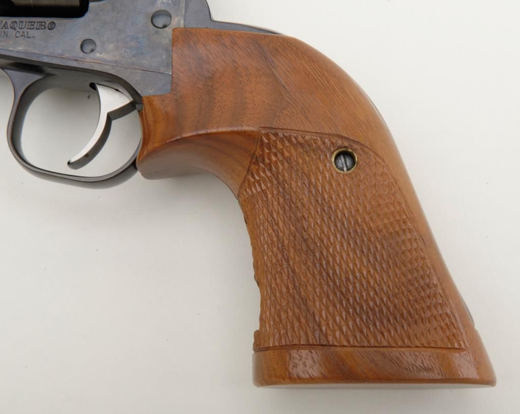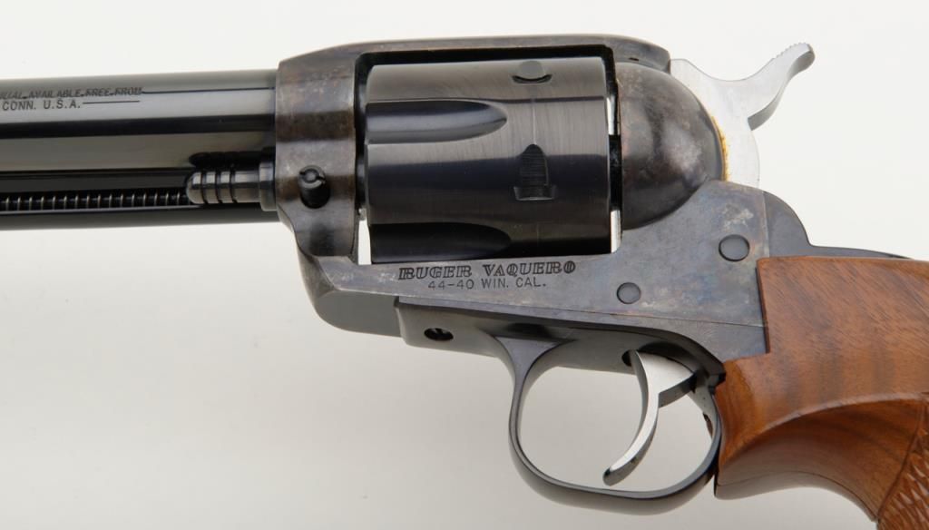 Ruger Vaquero single action revolver, .44-40 cal., 7-1/2” barrel, blue and case hardened finish, checkered custom wood grips, #55-84704 in overall fine condition showing the majority of its original finish, very good to fine bore, crisp action and markings, fine grips. Est.: $300-$500.