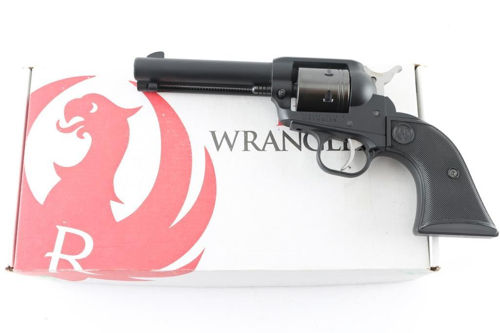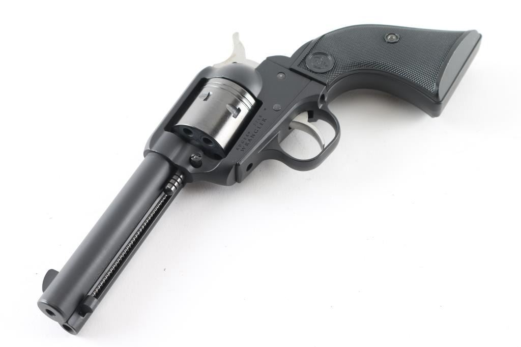 Western style single action rimfire revolver. Features matte black cerakote finish, checkered black plastic grips, 4.6" barrel, fixed sights, six shot unfluted cylinder. In overall like new condition with few handling marks, slight drag line on cylinder. Includes factory box. Condition is NRA Excellent *** Modern Firearm ***