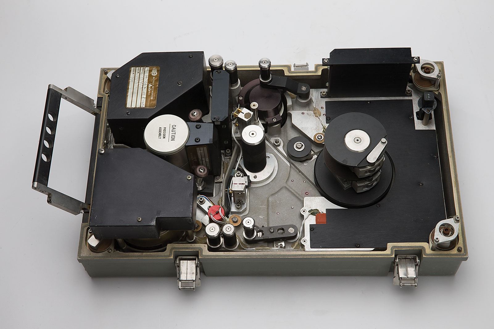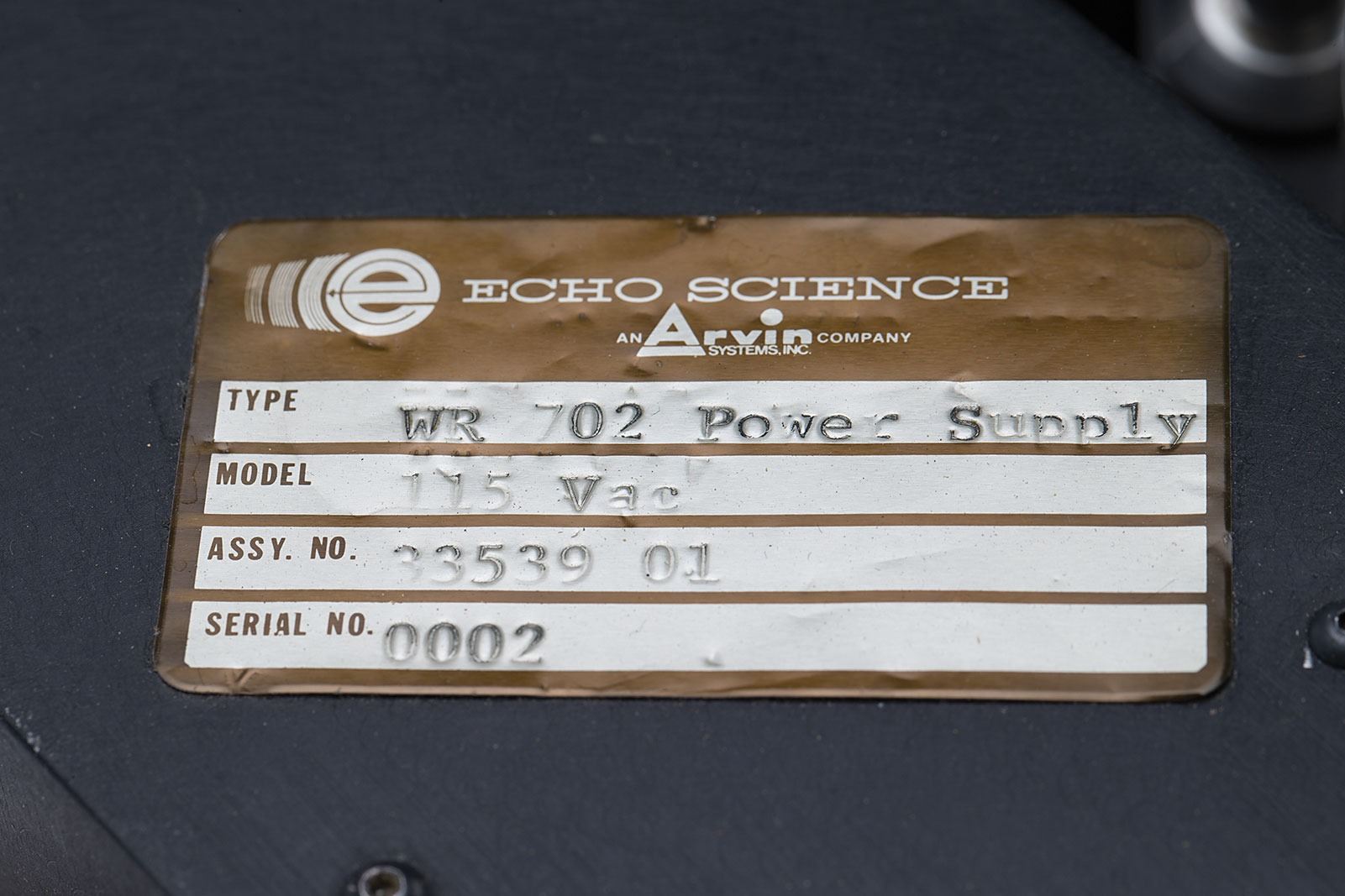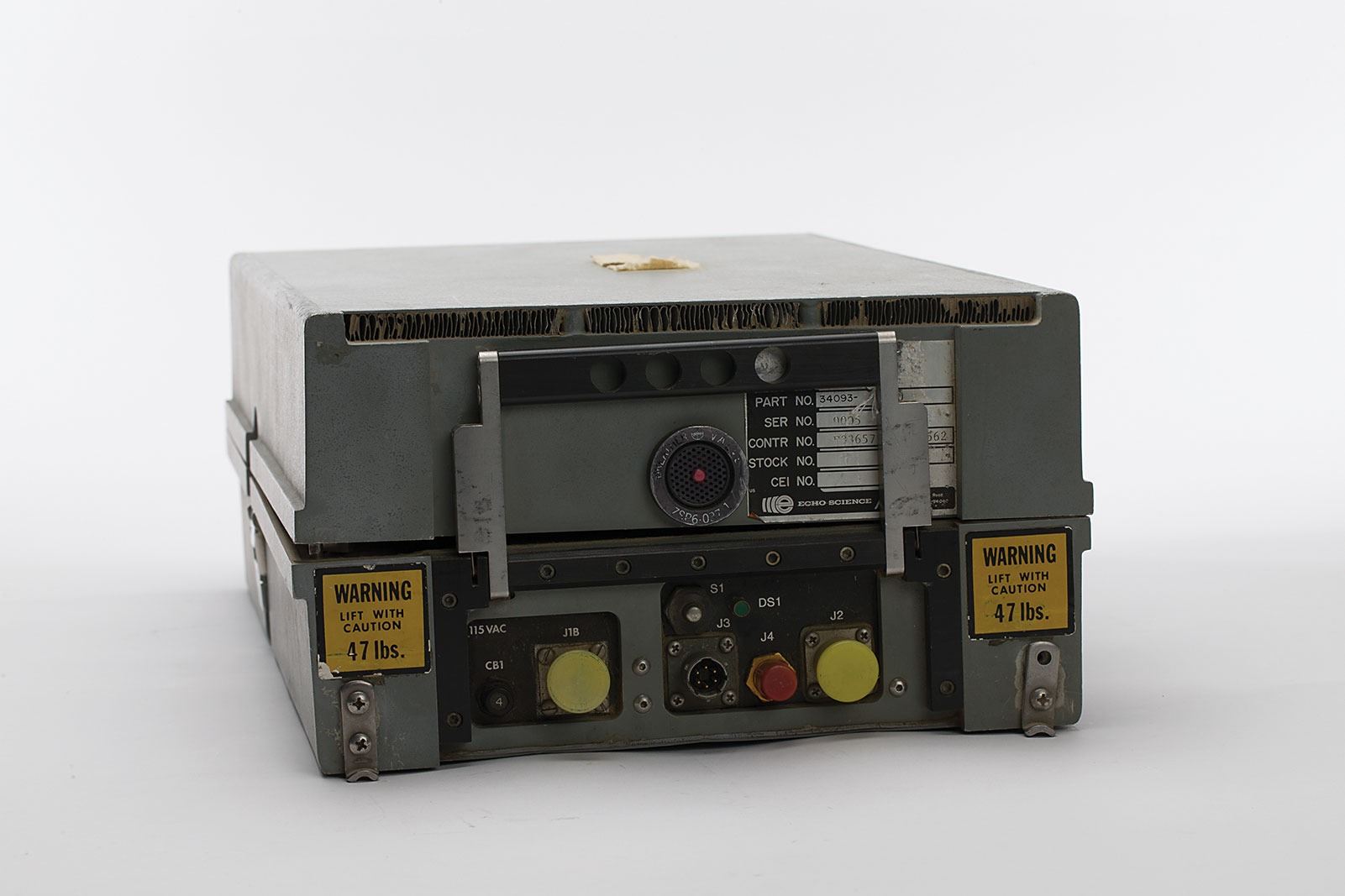 Rugged Echo Science Airborne Video Recorder used in an aircraft application, measuring 18? x 6? x 10.5?, with a tag on the exterior case reading: "Part No. 34093-33500, Ser. No. 0005, Contr. No. E33657 74 C 0562." A tag inside identifies it as "Airborne Video Rec., Model WR-702, Ser. No. 0005, Assy. No. 33500." In fine condition, with the inner reels missing. The WR-702 was developed for use in high performance aircraft environments, such as are encountered on F4, A7, F111, B1, and B52 fighter planes.