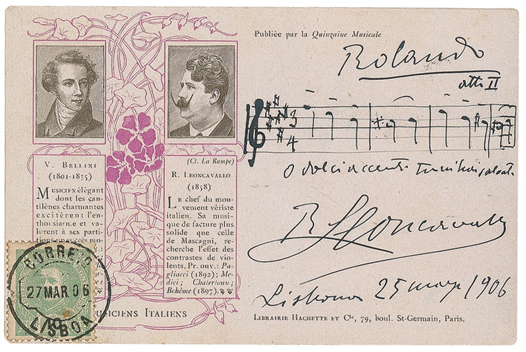 Italian composer (1857–1919) best known for his operas, particularly the beloved repertoire staple ‘Pagliacci’ (1892). AMQS signed “R. Leoncavallo,” on the correspondence side of a postcard bearing images of Leoncavallo and Bellini. The composer pens four bars of music and lyrics from Act II of Roland, signing underneath, “R. Leoncavallo, Lisbon 25 marzo 1906.” Postcard also bears a March 27, 1906, postal cancellation. In fine condition, with scattered light toning and soiling and a postage stamp and cancellation to lower left.