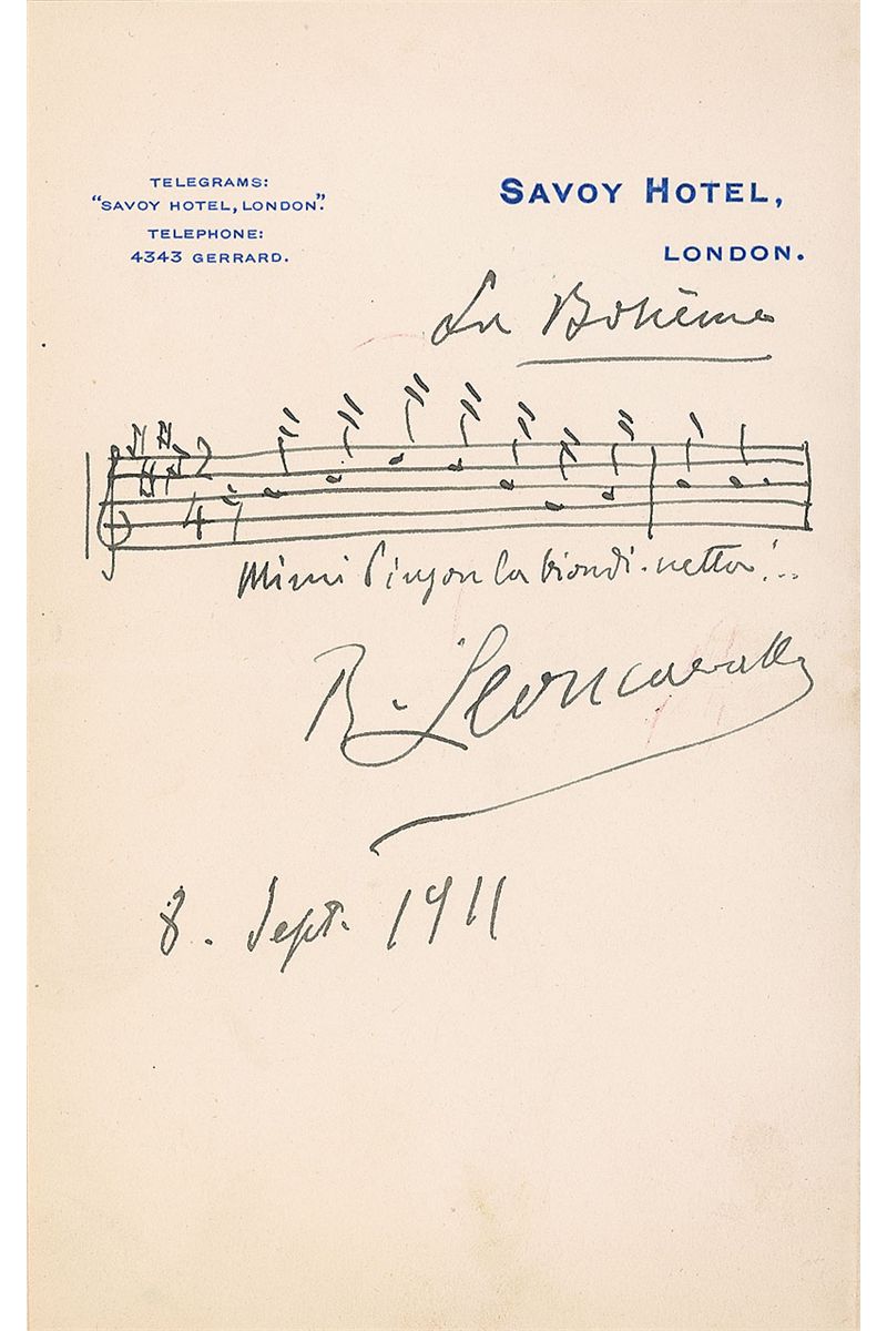 AMQS on a 4.5 x 7 off-white sheet of Savoy Hotel, London, stationery. Leoncavallo pens two bars of music and lyrics to ‘La Boheme,’ signing underneath, “R. Leoncavallo, 8. Sept. 1911.” In fine condition, with a central horizontal fold passing through a portion of signature, and a couple of stray red ink marks near signature.