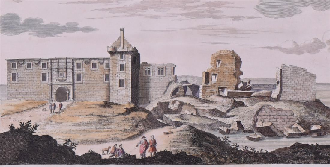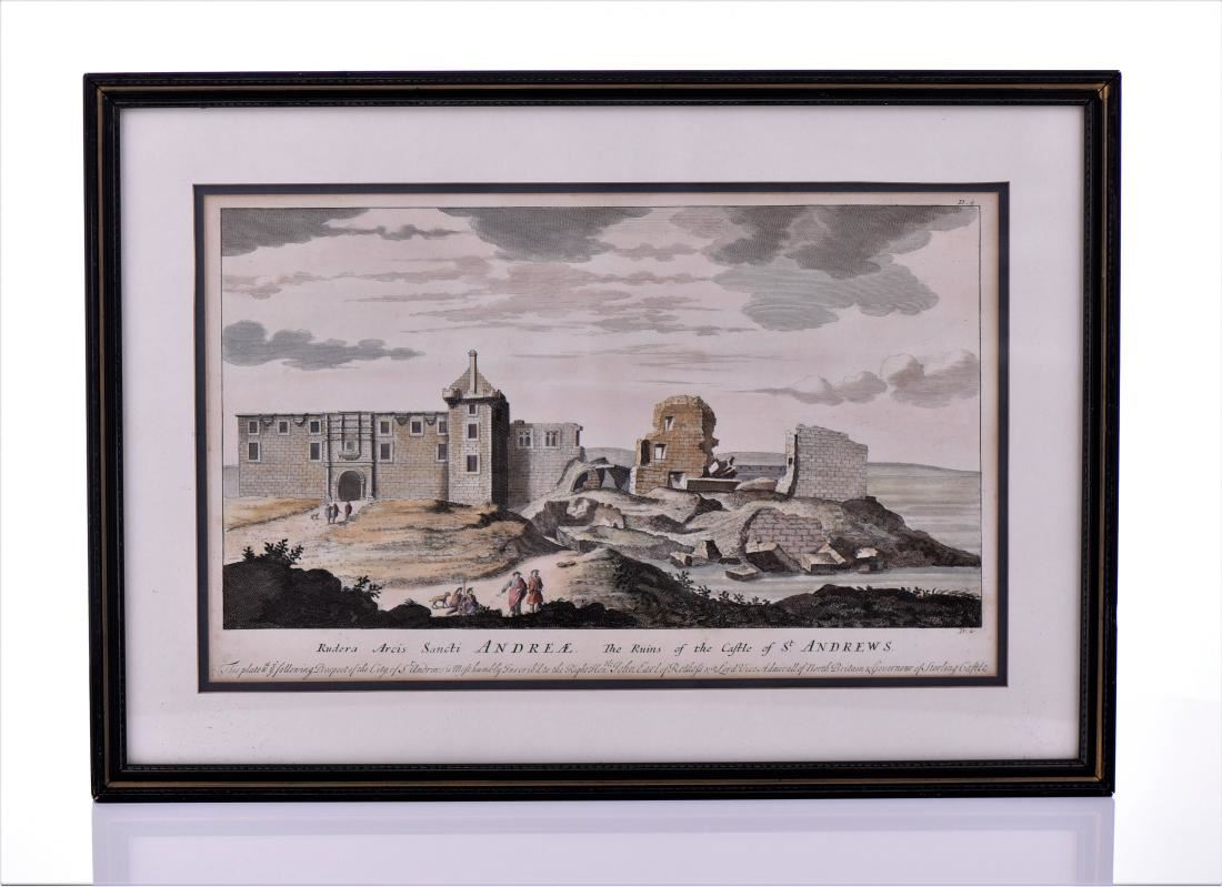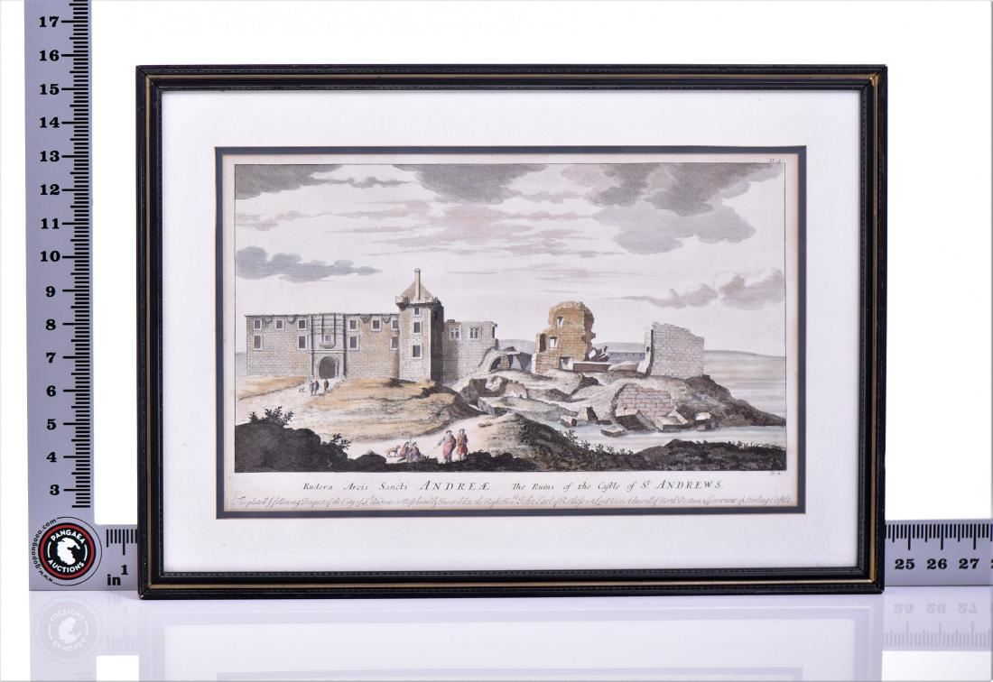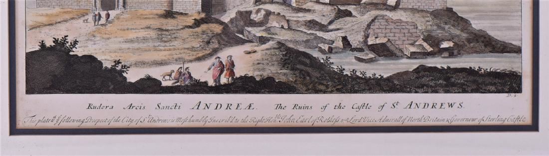 Ruins of St. Andrews Scotland 17th Century, hand colored copper plate engraving for John Leslie, 6th Earl of Rothes. Contemporary museum mounting Estimated more than 300 yrs old. (Pangaea Auctions) Size and/or Weight: See Measurement Photo. (Photos Represent The Lot Condition.)