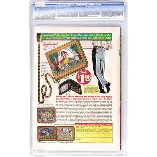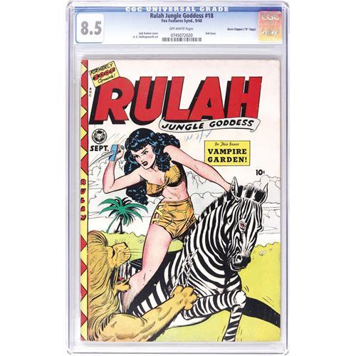 <B>Rulah Jungle Goddess #18 Davis Crippen ("D" Copy) pedigree (Fox Features Syndicate, 1948) CGC VF+ 8.5 Off-white pages.</B></I> This is the only slabbed copy of the issue we've seen that's not certified with pink pages, perhaps Fox ran out of cheap paper and used "the good stuff" for part of the print run! This copy's also tied for the highest grade CGC has assigned for this issue to date. The cover is credited to Jack Kamen. Inside the book, there's a scene Overstreet calls "classic girl-fight interior splash." Overstreet 2006 VF 8.0 value = $419; VF/NM 9.0 value = $665. CGC census 6/06: 3 in 8.5, none higher. <I>From the Crippen Collection.</B></I> <BR><BR><B>Important notice:</B> Heritage usually auctions material at the rate of 200-250 lots per hour. On some occasions eBay Live bid software or the Internet may not be able to keep up with the pace of the auction. We recommend placing a realistic absentee bid now as insurance to avoid disappointment. Occasionally the auctioneer may eliminate or reject an eBay Live bid, and the auctioneer may also reopen a lot after the close of the eBay live bidding (usually because we missed an audience bid), and may reject your bid even if it shows you as the winning bidder. By bidding via eBay Live, you agree that Heritage may award the lot to another bidder at its sole discretion under the circumstances described above or any other reasonable circumstances. Since eBay bids are not shown to us until we open the lot on the floor, we treat those bids just like floor bids. In most cases the floor responds before the eBay bid is presented to us, due to Internet lag time, so for consistency we have made it a policy that floor bids are always considered first over tie eBay live bids. Also please note that all Heritage lots purchased through eBay Live carry a 22.5% Buyer's Premium. Please make sure you read the Terms and Conditions before you bid. This lot is being auctioned in conjunction with a live floor auction by Heritage Auction Galleries. All final auction and invoice information will be supplied by Heritage Auction Galleries, and all other information should be considered preliminary. Lot:41001 <BR><BR><B>Winning Notification and Billing:</B> After the FINAL session in this auction is complete, Heritage will send e-mail and snail mail invoices. This process normally takes several days. All final auction and invoice information will be supplied by Heritage Auction Galleries, and all other information should be considered preliminary. <BR><BR>This auction will be conducted on a live auction floor and over the Internet through eBay Live. If you choose to place an absentee bid, please take a moment to <font color='#0000ff'><u><a href='http://pages.ebay.com/liveauctions/help/before/laabsentee.html'>learn how eBay Live absentee bidding works</a></u></font><font color='#000000'>