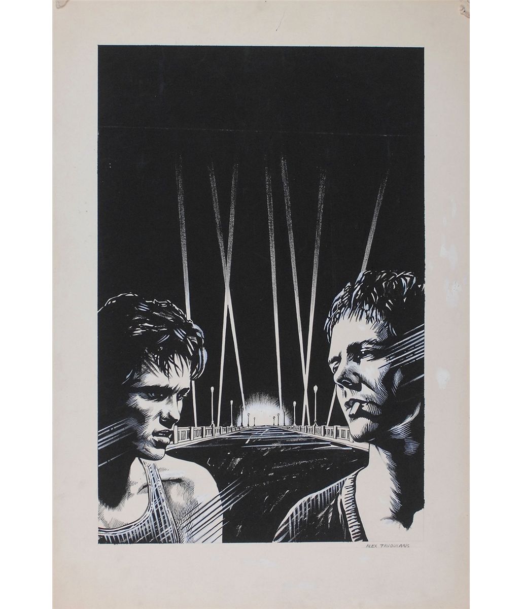Original concept art for Francis Ford Coppola’s 1983 film Rumble Fish, black and white gouache on an off-white 17.5 x 25.5 sheet of illustration board, signed in the lower right in pencil, “Alex Tavoularis.” In fine condition.