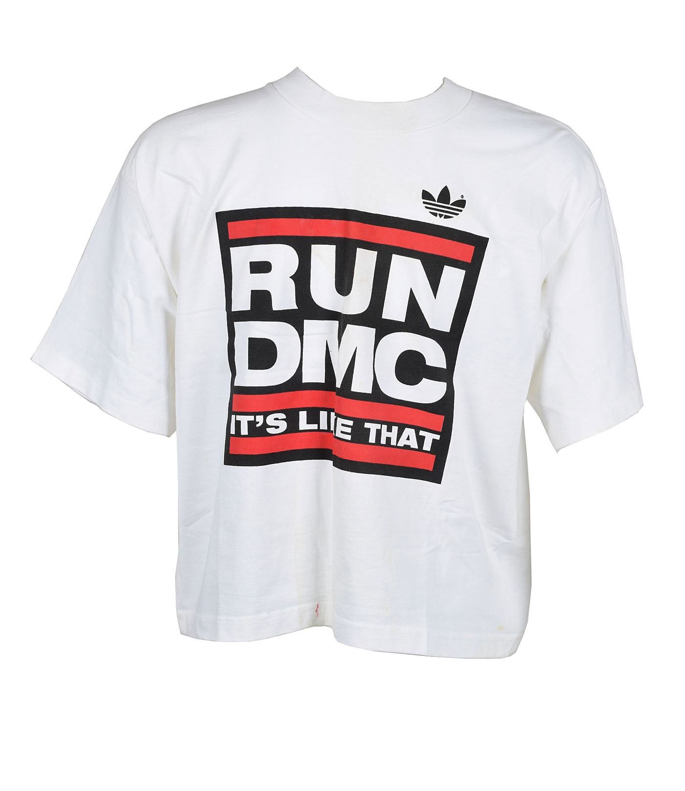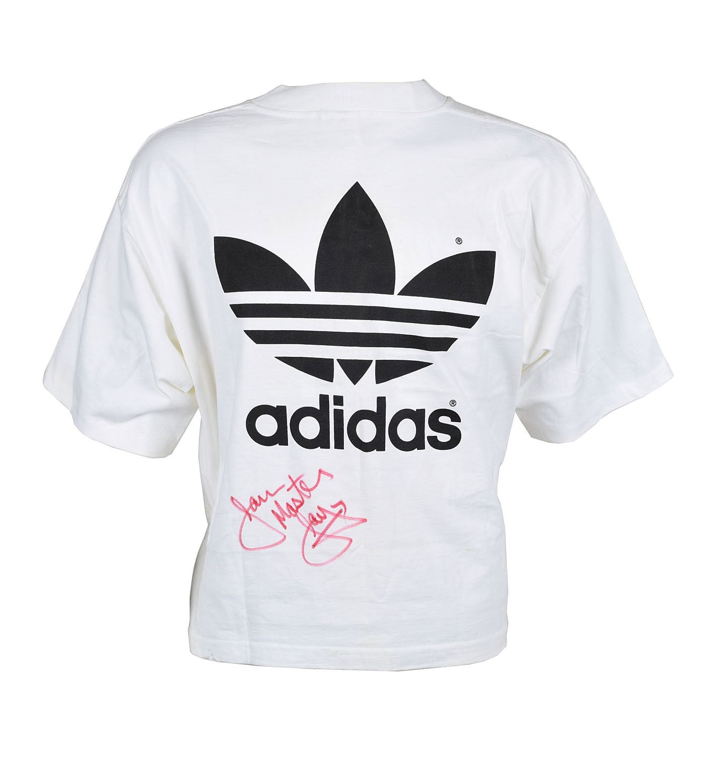 White short-sleeve t-shirt, no size but likely large, with front showing the RUN-DMC logo, a small Adidas logo, and white text, "It's Like That," the name of the group's debut single; the back of the shirt features a large Adidas logo and is signed in red felt tip by Jam Master Jay. In very good to fine condition, with some staining to lower portion.