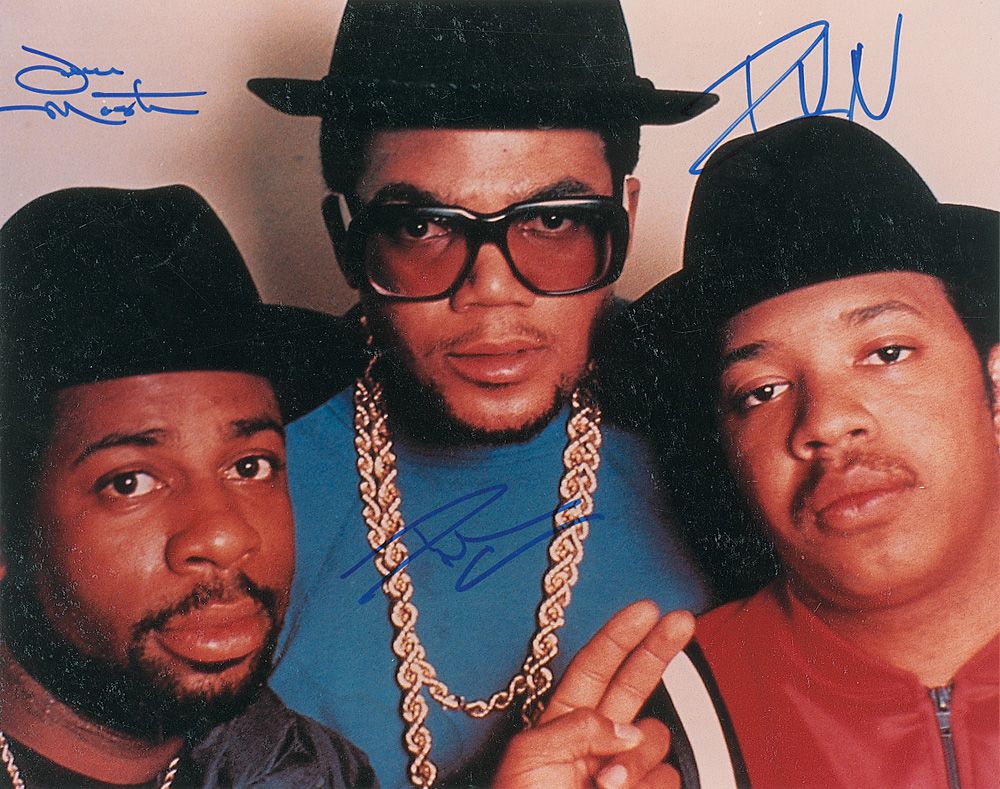 Uncommon color satin-finish 10 x 8 group photo, signed in blue felt tip with their nicknames by Jason ‘Jam Master’ Mizell, Darryl ‘D.M.C.’ McDaniels, and Joseph ‘Run’ Simmons. In fine condition, with some marks and spotting to the finish. Mizell was murdered in 2002 at a recording studio in Queens.