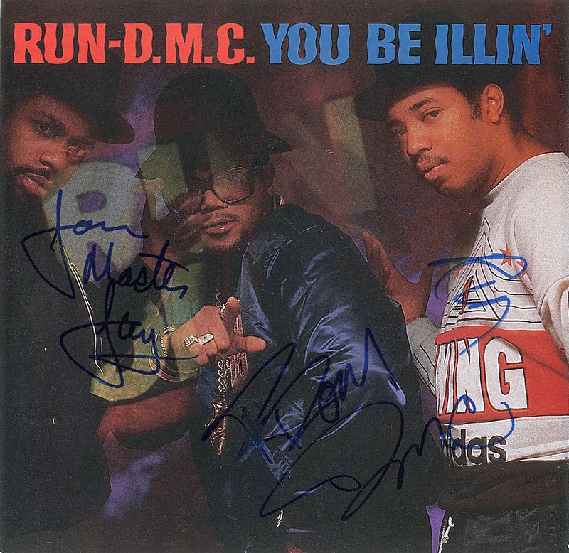 Color 45 rpm record sleeve for ‘You Be Illin’,’ signed in blue felt tip by Joseph ‘Run’ Simmons, Darryl ‘DMC’ McDaniels, and Jason ‘Jam Master Jay’ Mizell. In fine condition. Accompanied by a full letter of authenticity from Roger Epperson/REAL.