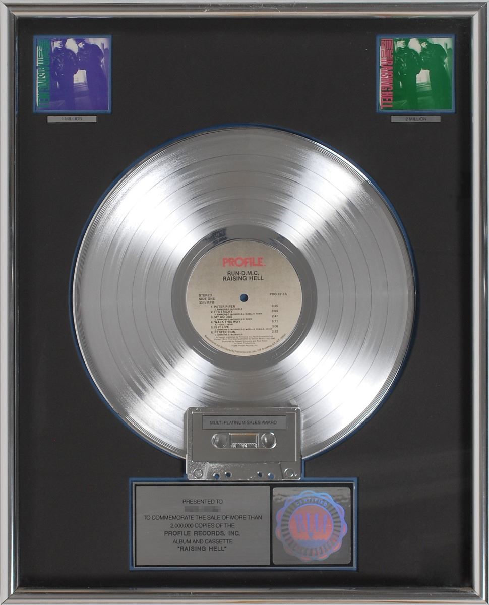 Official flower hologram-style RIAA double platinum sales award presented “to commemorate the sale of more than 2,000,000 copies of the Profile Records, Inc. album and cassette ‘Raising Hell.’” Framed with its disc, cassette, plate, and two small images of the album cover, both denoting platinum sales, to an overall size of 17 x 21. Award retains its original backing with a Fitzgerald Hartley label. In fine condition.