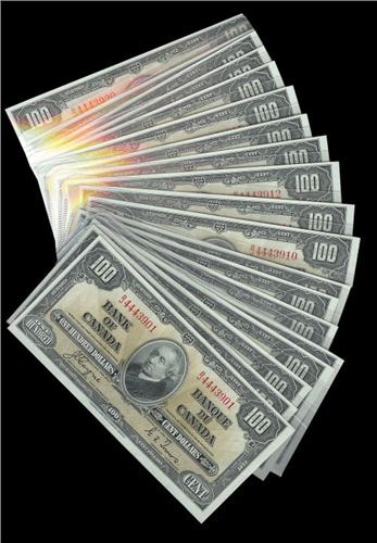 Run of 20 consecutive 1937 $100 notes. All BC-27c Coyne-Towers B/J4443901 to 3920. All original and choice uncirculated. First time ever offered such a rare sequential run! A great portfolio investment lot!
