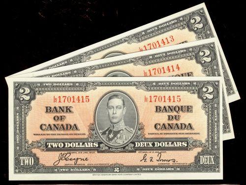 Run of 3 consecutive 1937 $2 notes. BC-22c Coyne-Towers L/R1701413 to 1415. All gem uncirculated. Scarce prefix note!