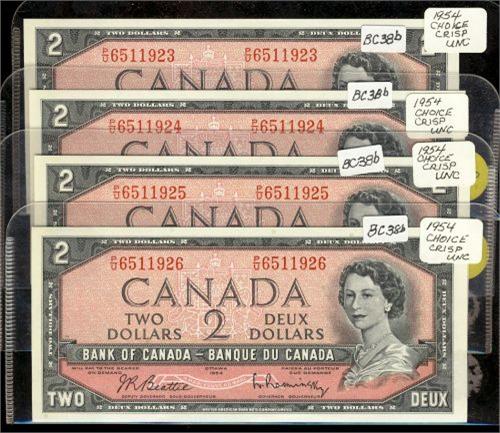 Run of 4 consecutive 1954 $2 notes, BC-38b P/U6511923 to 1926. All choice uncirculated.