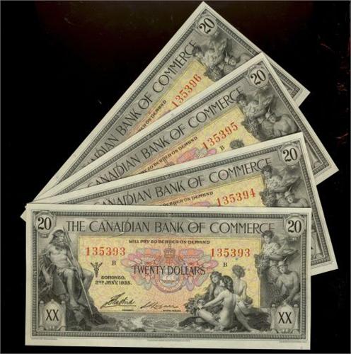 Run of 4 consecutive notes. The Canadian Bank of Commerce 1935 $20 No.135393 - 5397. All choice uncirculated. Seldom seen so nice!