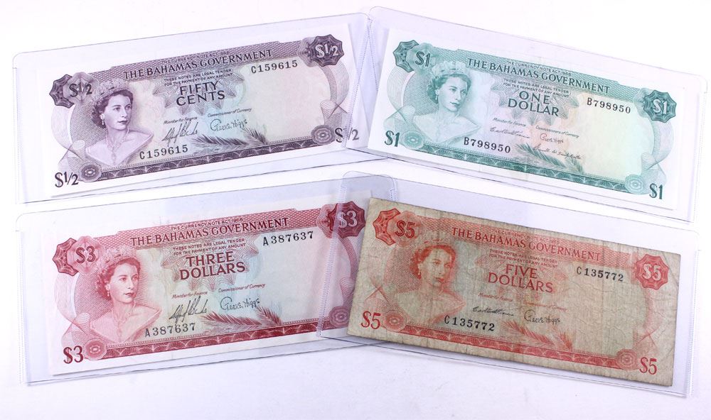 Run of 4 different denominations of 1965 Bahamas banknotes. $1/2, $1, $3, and $5. Grades range from VG to UNC
