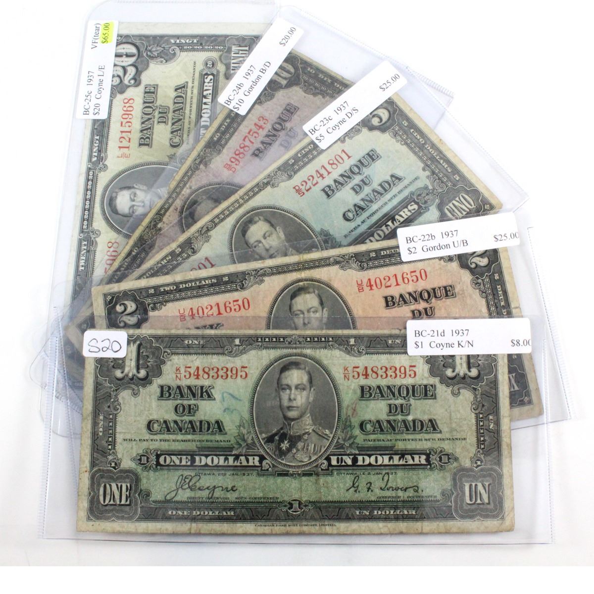 Run of 5 Different Denominations from the 1937 Series. You will receive a $1, $2, $5, $10, and $20. The Notes are in good or Better Condition . Buyers Premium will be added on all items as per our terms of sale. We accept Paypal, Credit Card, E-Transfer Payments, Cheque or Money Orders (there is an additional 3% fee for using Paypal or Credit Card). All invoices will be emailed immediately following the auction, please contact us if you would like to pay by credit card or receive a new revised lower total for mailing in payment or sending an e-transfer (3% discount). All Items Are Sold "AS IS", no returns