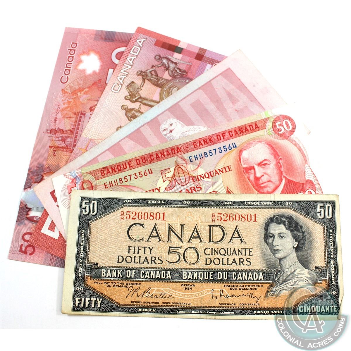 Run of Five Different $50 Notes from Five Different Series from 1954 to 2012. Included is a 1954 Modified Portrait, 1975, 1988, 2004 and 2012. 5 pcs.