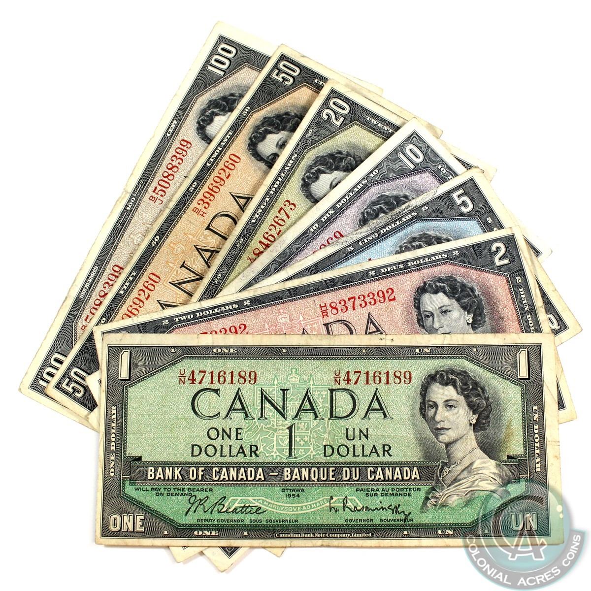 Run of Seven Different Denominations of 1954 Modified Portrait Banknotes. Included is a $1, $2, $5, $10, $20, $50 and $100. 7 pcs.