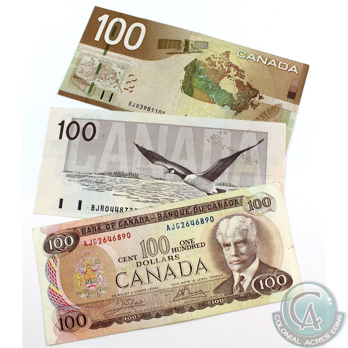 Run of Three $100.00 Notes from the Bank of Canada spaning from 1975 to 2004. Included is a 1975, 1988 and 2004. 3 pcs.
