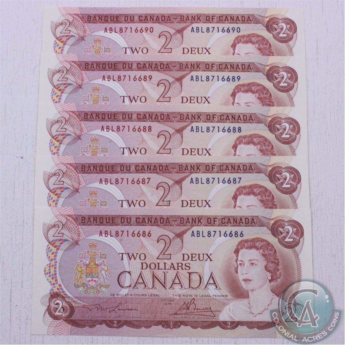 Run of five 1974 Canada $2.00 notes with consecutive serial numbers all in UNC Condition.