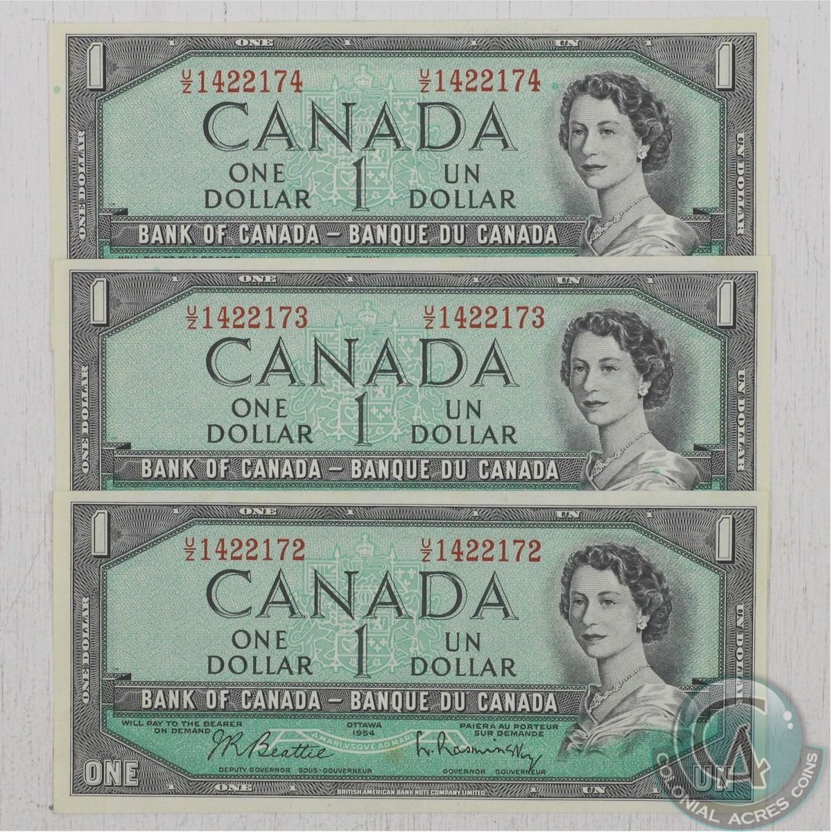 Run of three 1954 Canada $1.00 notes with consecutive serial numbers in UNC Condition.