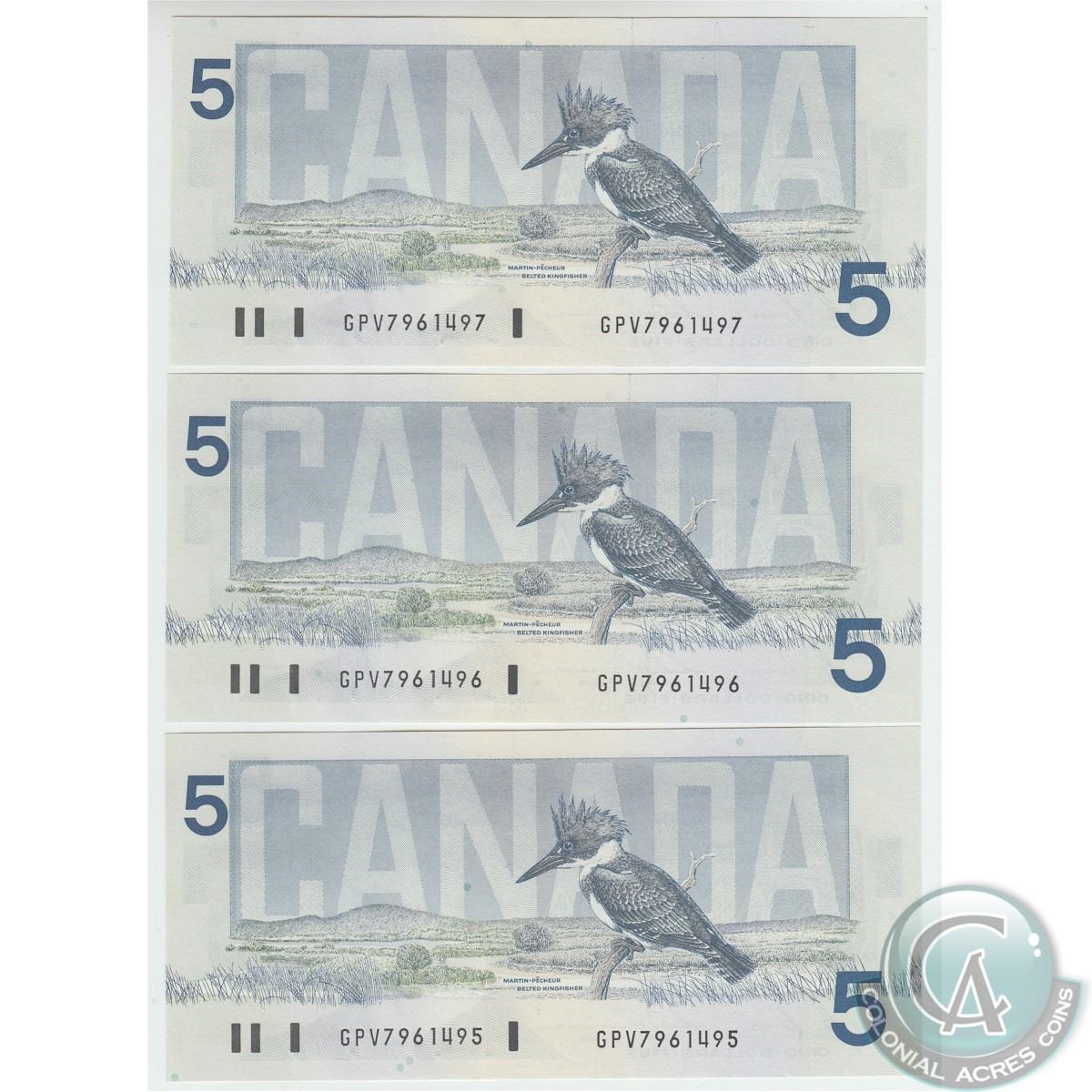 Run of three 1986 Canada $5.00 notes with consecutive serial numbers all in UNC Condition.