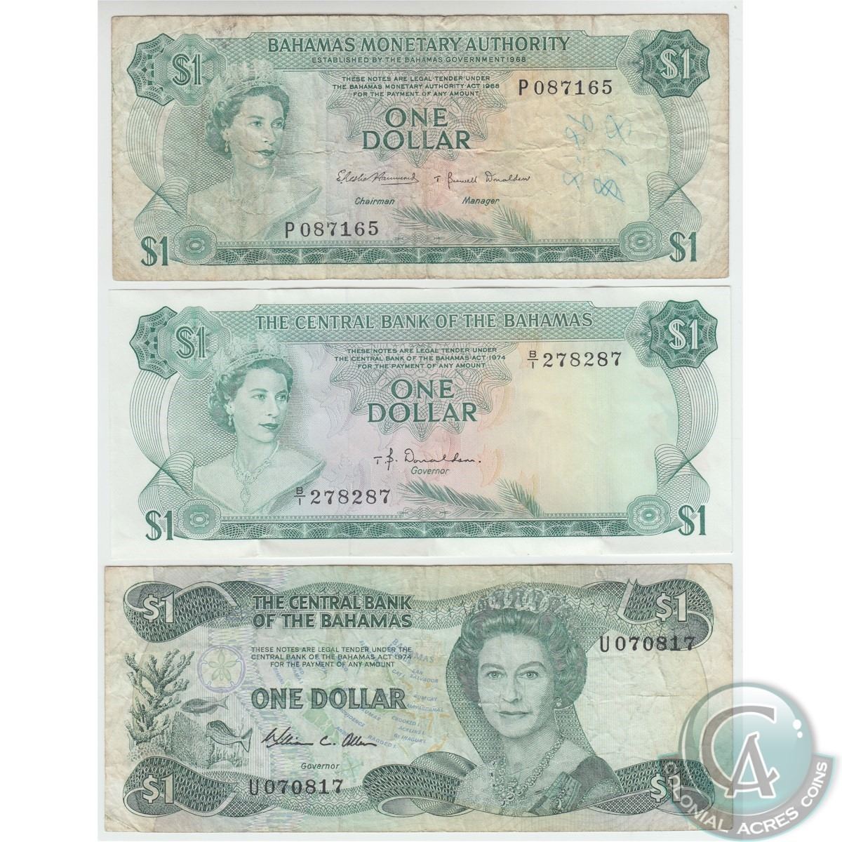 Run of three different dates of $1.00 notes from the Bahamas, dates included; 1968, 1974 and 1984. 3