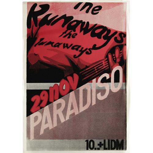 <B>Runaways Paradiso Concert Poster (1977)</B></I> The Runaways formed in 1975 as a Kim Fowley production. By 1977's European tour, the band line-up consisted of Joan Jett, Sandy West, Lita Ford and Vicki Blue. Here's a sharp red and black poster for the band's November 29th show at Amsterdam's Paradiso club. It measures 17" x 24", and is in NM- condition. Ch-Ch-Ch-Cherry Bomb!