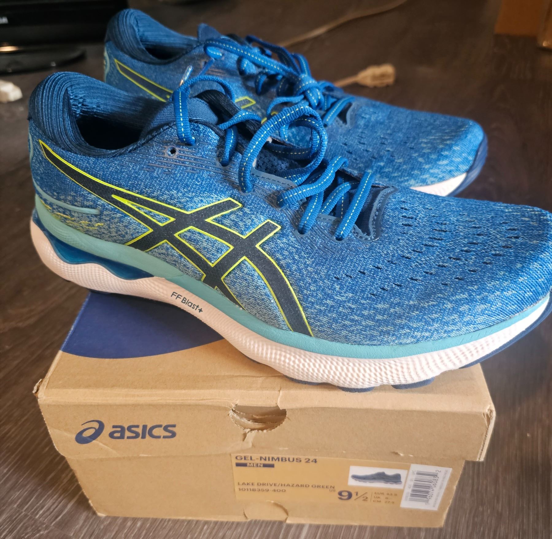 Asics Gel-Nimbus 24, Size 9.5 mens running shoes, Lake Drive/Hazard Green, New