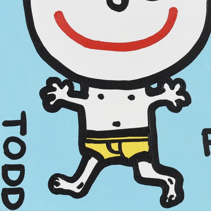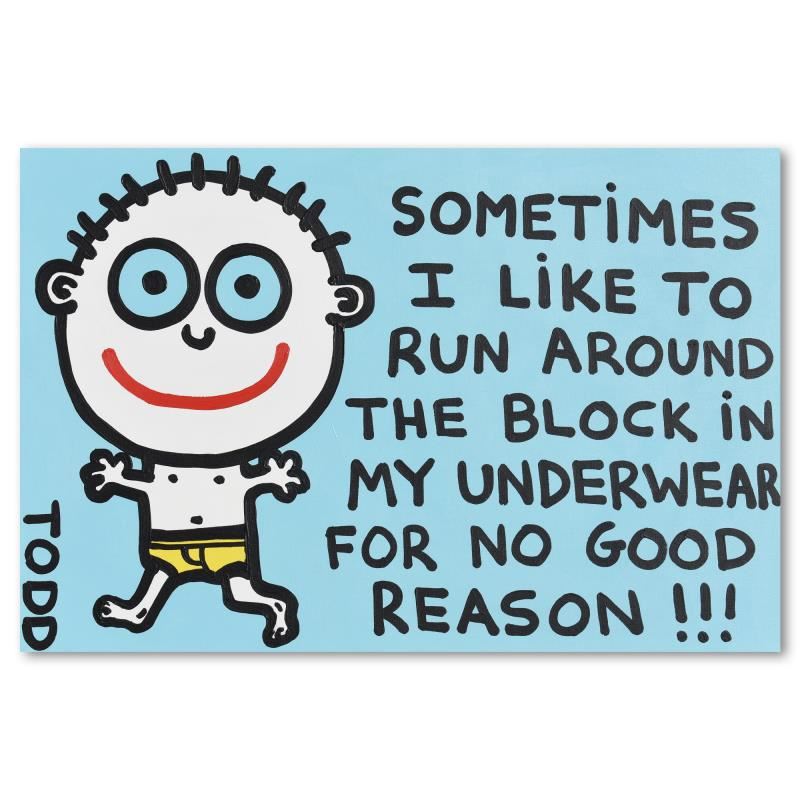 "Running Around" is an original acrylic painting on gallery wrapped canvas by Todd Goldman, hand signed by the artist. Includes Letter of Authenticity. Measures approx. 36" x 24" (image). Due to the way this piece was stored there may be minor wear or signs of age (such as wear on the corners) but the piece is in overall good condition.