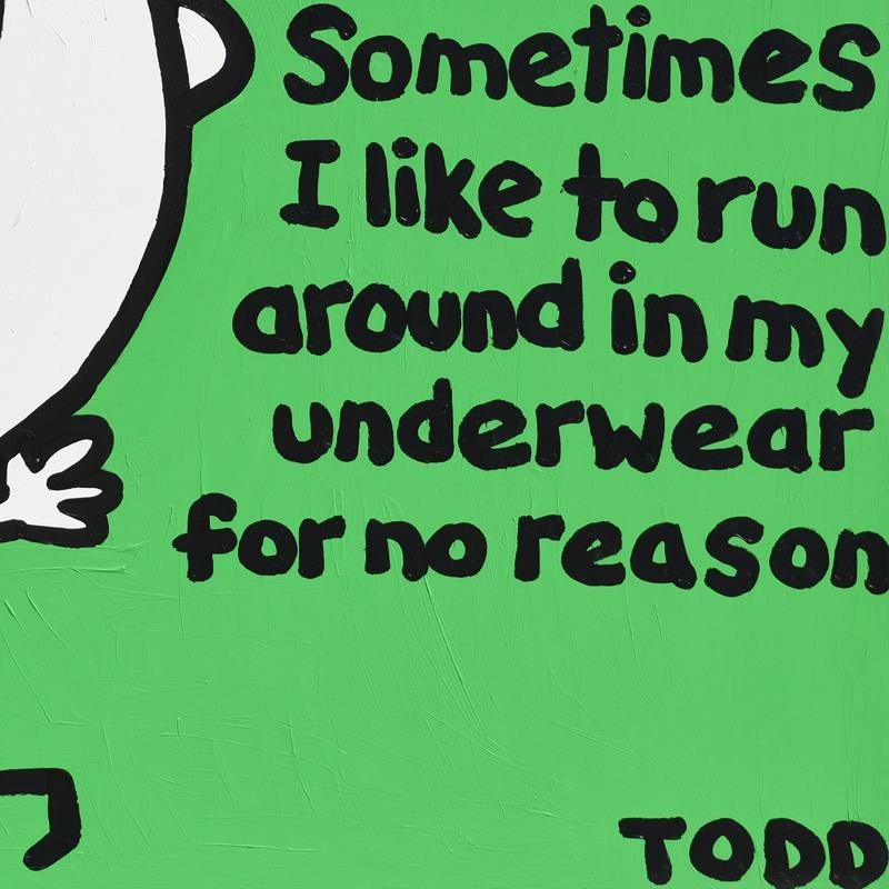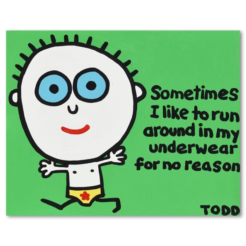 "Running Around" is an original acrylic painting on gallery wrapped canvas by Todd Goldman, hand signed by the artist. Includes Letter of Authenticity. Measures approx. 60" x 48" (image). Due to the way this piece was stored there may be minor wear or signs of age (such as wear on the corners) but the piece is in overall good condition.