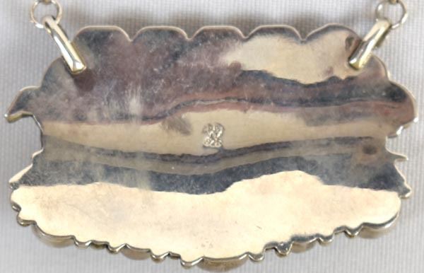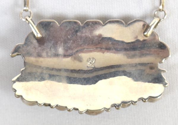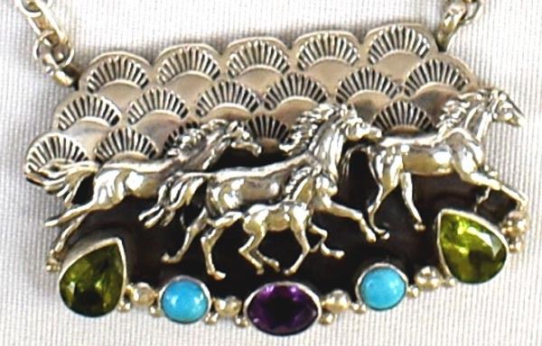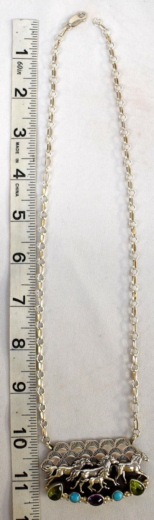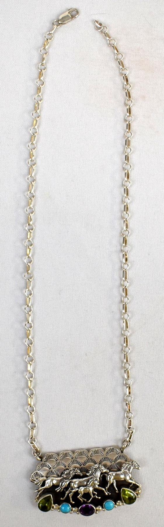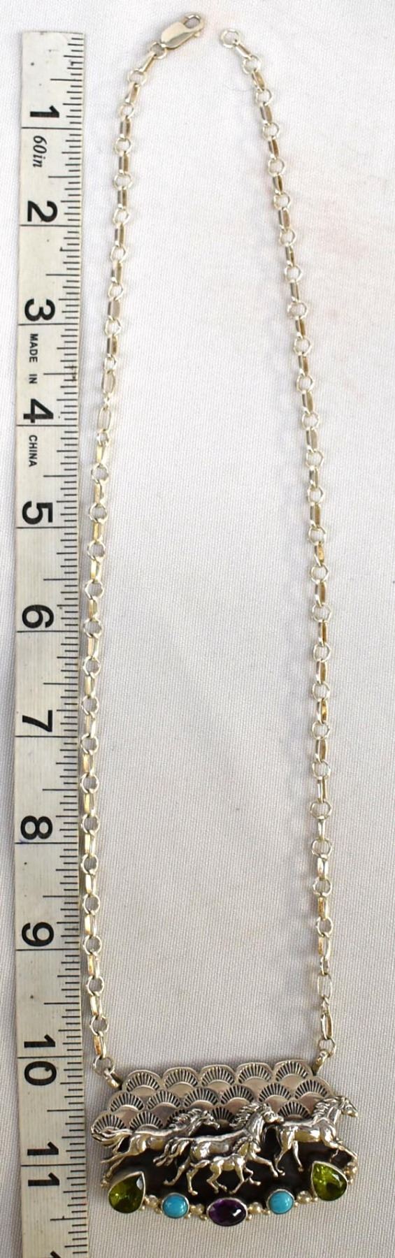 Running Bear Navajo Sterling Multi-Stone Horse Pendant Necklace, pendant measures 2.5'' x 1.5'', hand wrought chain measures 20''L end to end, hallmarked and stamped .925, gemstones include turquoise, peridot, and amethyst, 45.41 grams total wt.
