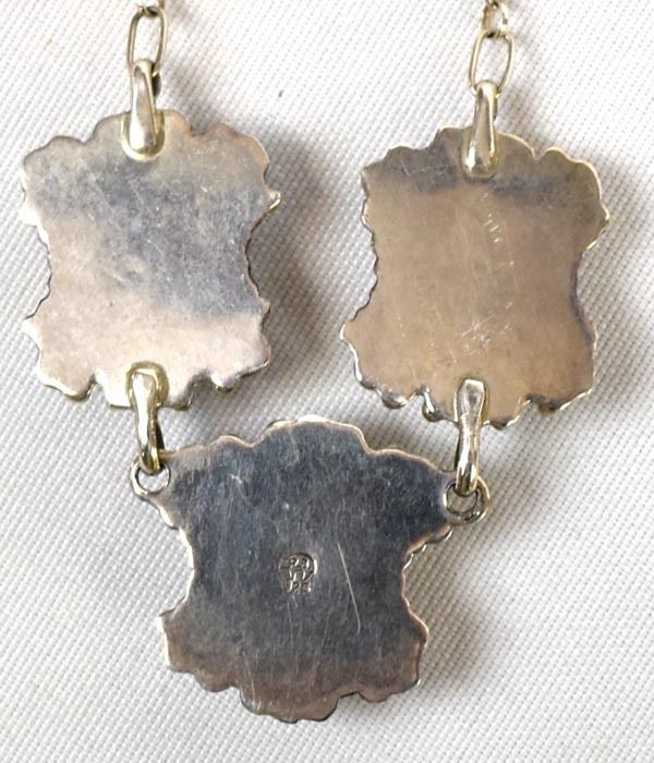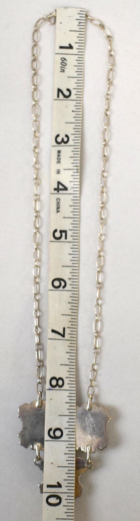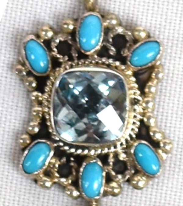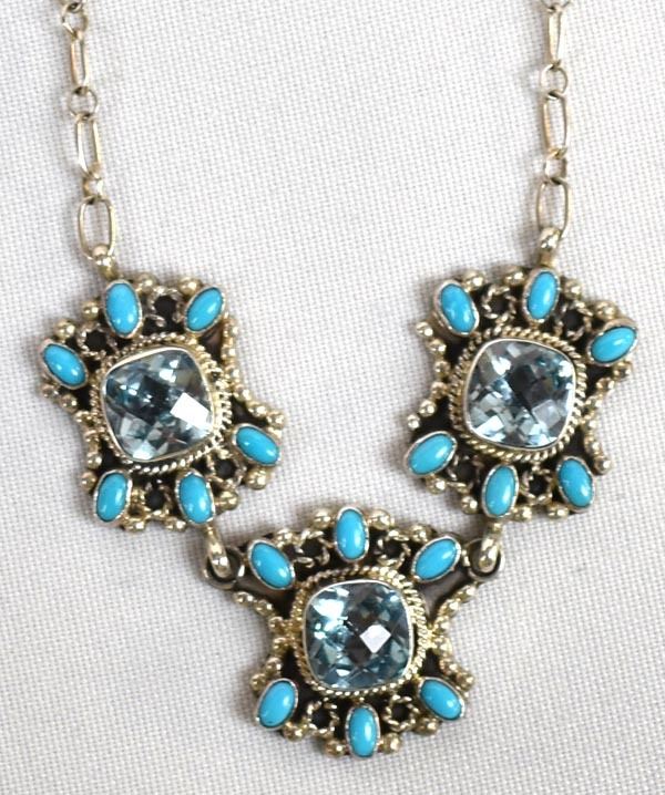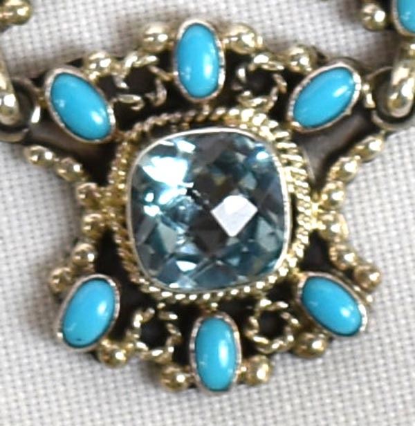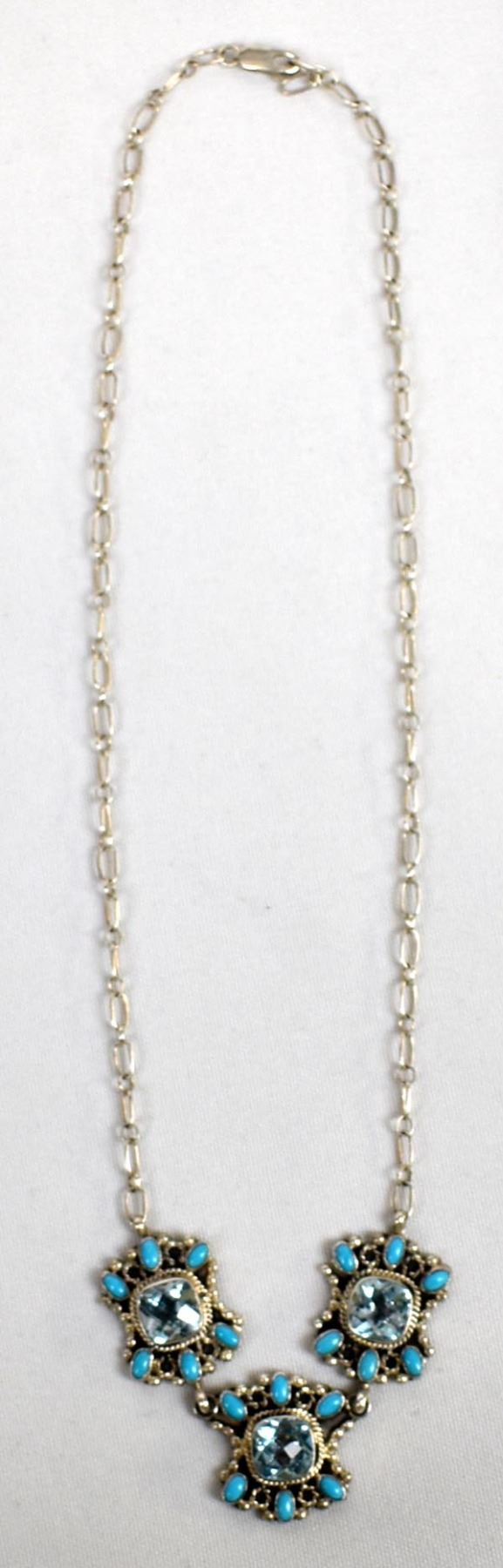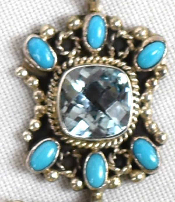 Running Bear Sterling, Blue Topaz, and Turquoise Necklace, measures 18''L end to end, drop pendant measures 1'' x 1'', hallmarked and stamped .925, hand wrought chain, 23.47 grams total wt.