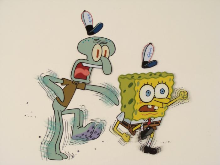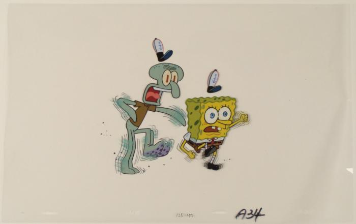This original animation cel is from the Nickelodeon TV show SpongeBob Squarepants. The story takes place under the deep blue sea in Bikini Bottom, where SpongeBob resides. SpongeBob, who is a yellow, porous sponge, is your typical happy-go-lucky character, as he is always cheerful and enjoys making people laugh. Patrick Star, SpongeBob's neighbor who is a starfish, is your average children's show idiot, as he boasts knowing nothing and is often getting himself into ridiculous situations. Between the homes of these two lies the home of the miserable Squidward, a squid, who is known for being grouchy and playing tricks on SpongeBob and Patrick. Both SpongeBob and Squidward work at the Krusty Krab, a fast food business run by the greedy money-loving Mr. Krabs, a crab, the arch rival of the evil, possibly misunderstood, Plankton. Another neighbor, Sandy Cheeks, an athletic squirrel who normally wears an astronaut's space suit, was introduced in "Tea at the Treedome." She spends most of her time inventing and experimenting. Squidward and SpongeBob appear to be running for their life.Original Production Animated Cel Overall Size of Cel: 10 1/2" x 16 3/4" Very Good ConditionThis is an original hand-painted cel set-up used in the production of an episode of "SpongeBob SquarePants." Each one-of-a-kind set-up represents a slight change in position of the characters. When individually photographed and projected in rapid succession, the images appear to move.