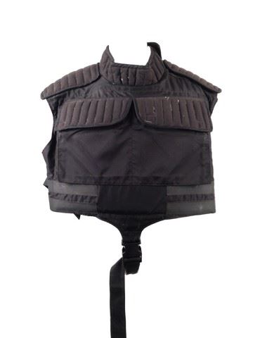 Running Man (1987) - Soldier #2 (Joel Kramer) black Game Guard protective, collared vest. Inside label reads "Center Theater Group" with "Joel Kramer" handwritten.