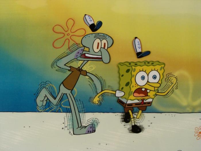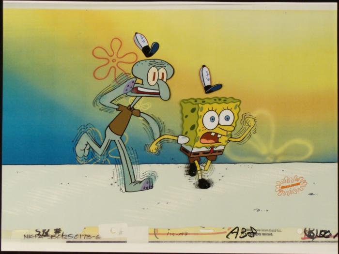 This original hand-painted background and animation cel is from the Nickelodeon TV show SpongeBob Squarepants. The story takes place under the deep blue sea in Bikini Bottom, where SpongeBob resides. SpongeBob, who is a yellow, porous sponge, is your typical happy-go-lucky character, as he is always cheerful and enjoys making people laugh. Patrick Star, SpongeBob's neighbor who is a starfish, is your average children's show idiot, as he boasts knowing nothing and is often getting himself into ridiculous situations. Between the homes of these two lies the home of the miserable Squidward, a squid, who is known for being grouchy and playing tricks on SpongeBob and Patrick. Both SpongeBob and Squidward work at the Krusty Krab, a fast food business run by the greedy money-loving Mr. Krabs, a crab, the arch rival of the evil, possibly misunderstood, Plankton. Another neighbor, Sandy Cheeks, an athletic squirrel who normally wears an astronaut's space suit, was introduced in "Tea at the Treedome." She spends most of her time inventing and experimenting. SpongeBob and Squidward appear to be running for their livesOriginal Production Background and Animated Cel Overall Size of Background: 10 1/2" x 14 1/2" Overall Size of the Cels: 10 1/2" x 12 1/2" Very good conditionThis is an original hand-painted cel set-up used in the production of an episode of "SpongeBob SquarePants." Each one-of-a-kind set-up represents a slight change in position of the characters. When individually photographed and projected in rapid succession, the images appear to move.
