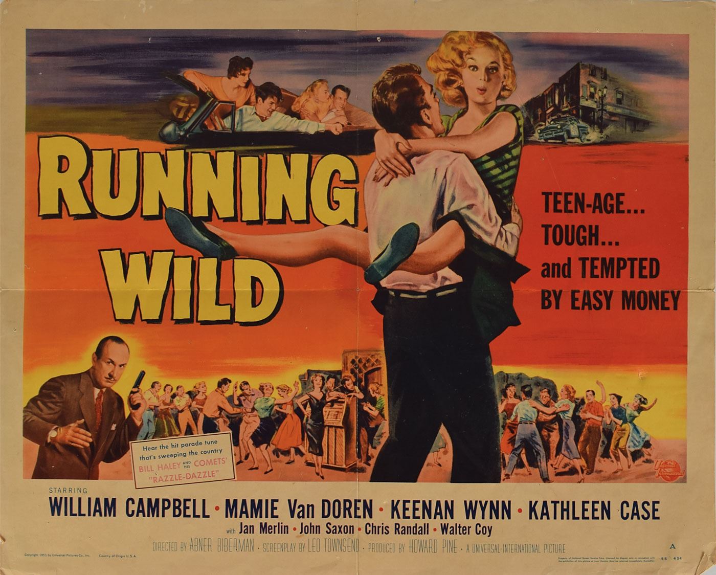 Original color 28 x 22 half-sheet movie poster for the 1955 crime drama Running Wild, with text to right side, "Teen-Age…Tough…and Tempted By Easy Money," and a box below promoting the film's musical single: "Hear the hit parade tune that's sweeping the country, Bill Haley and His Comets' 'Razzle–Dazzle.'" Folded and in very good condition, with multiple tack holes, a small tear, and minor paper loss at the fold intersections.