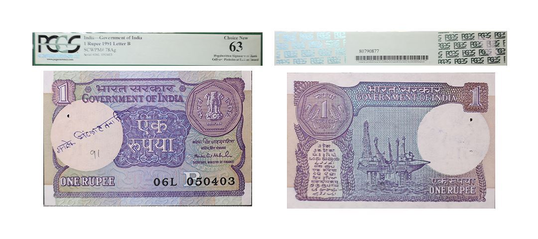 Rupee 1, 1991, signed Montek Singh Ahluwalia, signed autograph in Devnagari of the Finance Secretary in the watermark area. Graded by PCGS 63 Choice New. Kishore Jhunjhunwalla Collection.