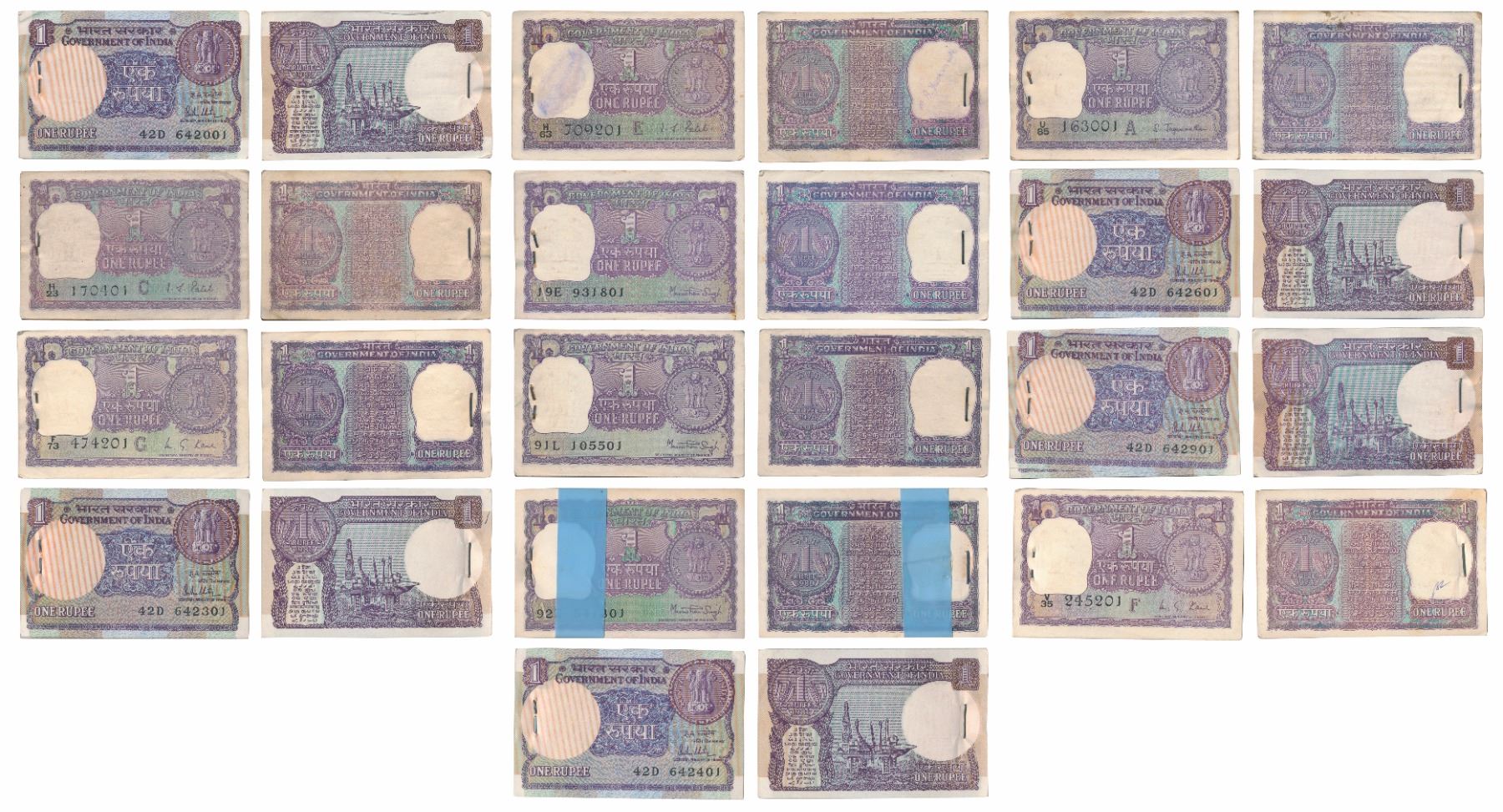 Rupee 1 bundle (13), 1967, 1970, 1972, 1974 (2), 1976, 1978, 1980, 1981 (5), signed S. Jagannathan, I. G. Patel (2), M.G. Kaul (2), Dr Manmohan Singh (3), R. N. Malhotra (5), Total of 13 Bundles. Uncirculated. (1300)