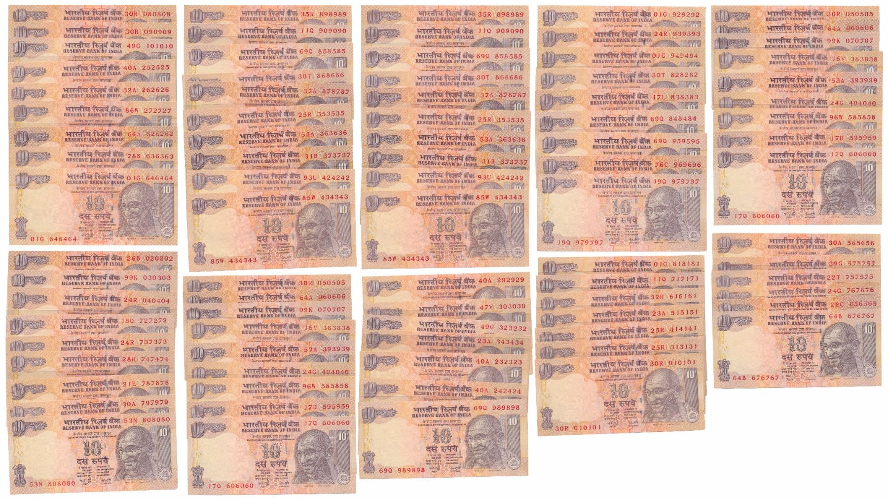 Rupee 10, signed Y. V. Reddy expect one D. Subbarao, fancy number 010101 to 101010 (10), 232323 to 272727 (5), 292929-323232 (4), 343434-434343 (10), 454545-545454 (10), 565656-656565 (10), 676767-767676 (10), 787878-878787 (10), 898989-909090 (2) and 929292-989898 (7). Uncirculated. (78)