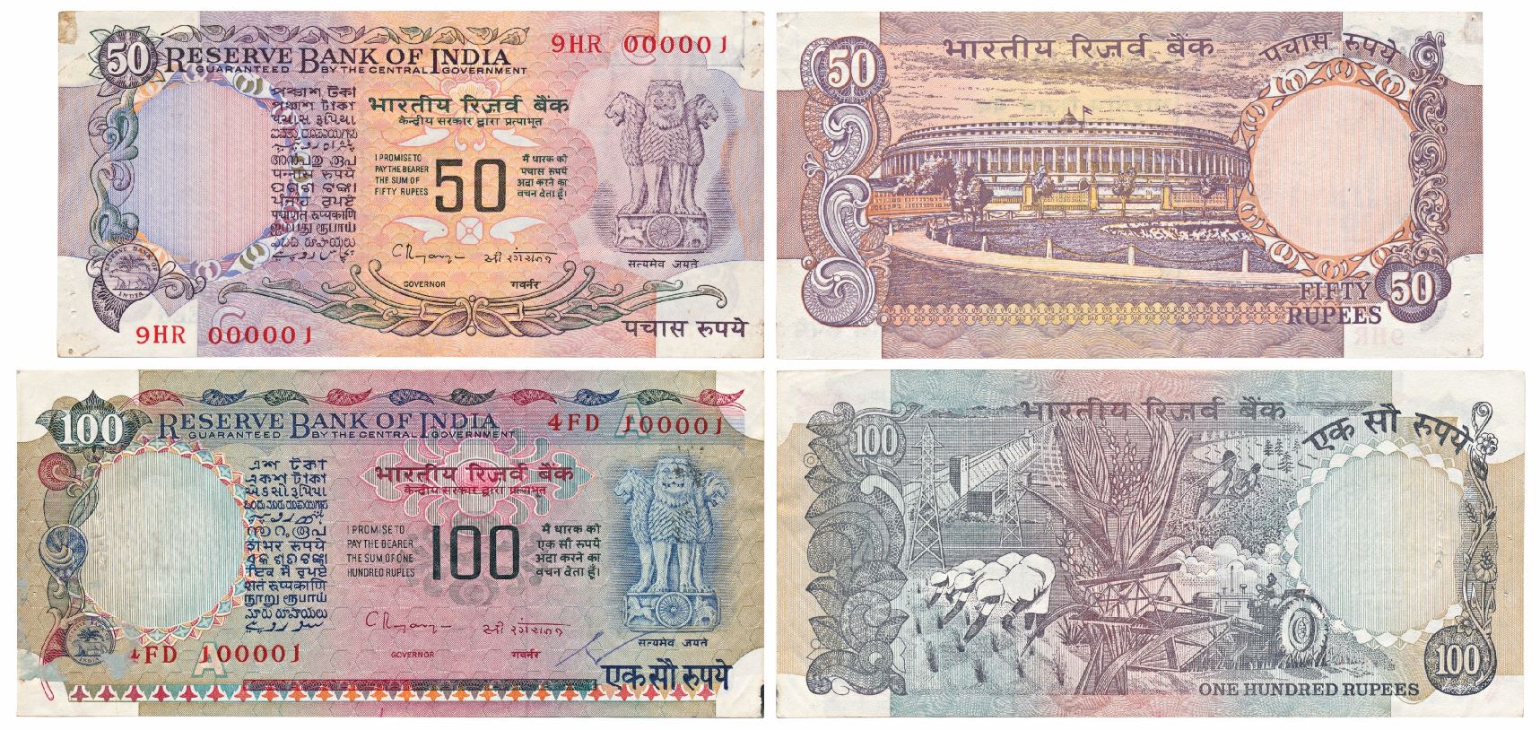 Rupee 50 and 100, signed C. Rangarajan, fancy number 000001 and 100001. Extremely Fine and About Uncirculated. (2)