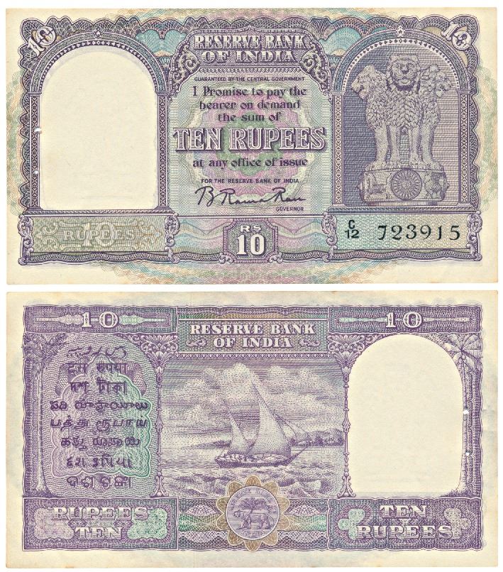 Rupees 10, 1950, signed B Rama Rau, value written in English only, in order of consecutive serial number with the next lot (J&R 6.4.1.2). Uncirculated, Rare.