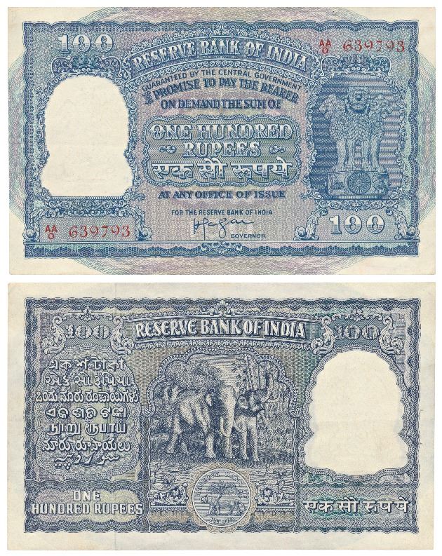 Rupees 100, 1953, signed H.V.R. Iengar, (J&R 6.7.3.2). Uncirculated, Rare in such a high grade. A similar condition note sold in Todywalla Auctions 107 Lot No. 651 for Rs. 24,000.