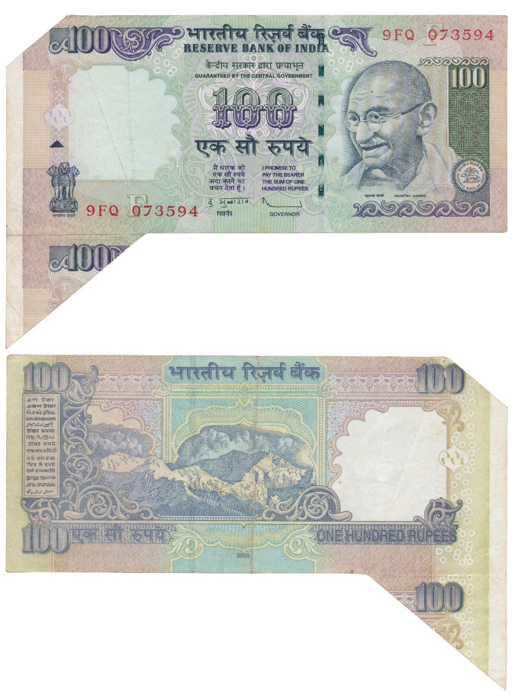 Rupees 100, 2009, signed D. Subbarao, Error, margin with extra paper at the left and part of the next note attached at the bottom. About Extremely Fine.