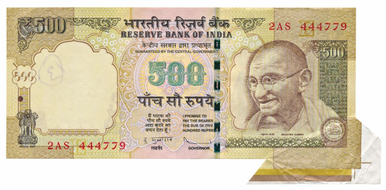 Rupees 500, 2012, signed D. Subbarao, Error, misprinted with extra paper and an uneven cut in bottom right corner. Uncirculated.