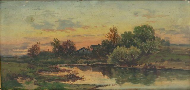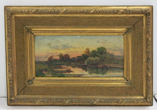 Oil on board. Gilt wood framed. Approx. 12" x 24" without frame, 27" x 39" with frame. Scratched & chipping.