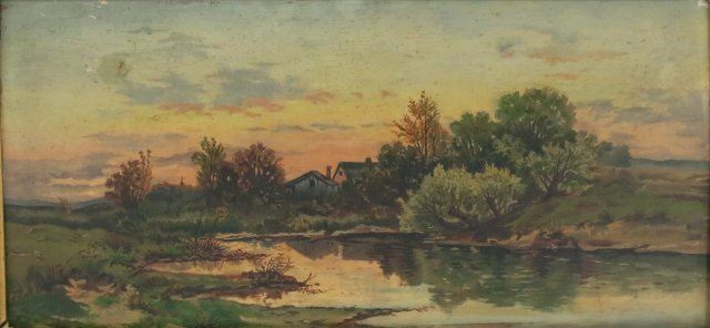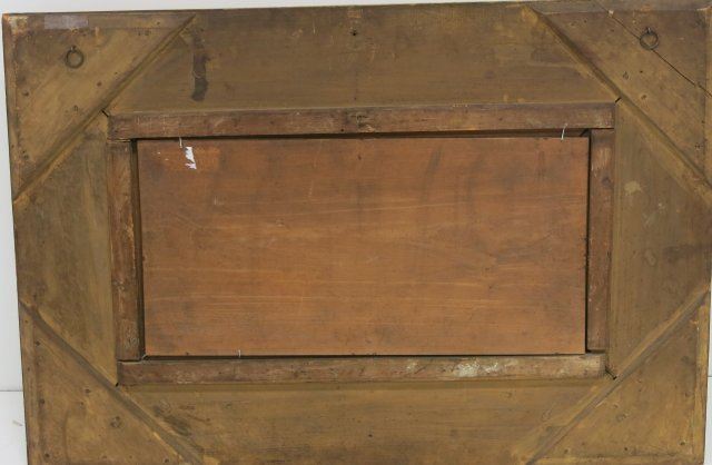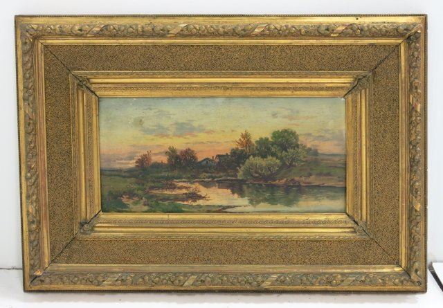 Oil on board. Gilt wood framed. Approx. 12" x 24" unframed, 27" x 39" framed. Chipping.