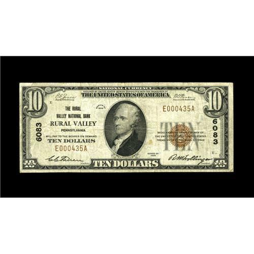 <B>Rural Valley, PA</B></I> - $10 1929 Ty. 1 <B>The Rural Valley NB</B></I> Ch. # 6083<BR>This <B>Fine+</B></I> is one of only two of its type and denomination traced from this idyllically named bank.<BR><BR><b>Shipping:</b> Coin/Currency (<a target="_blank" href="http://www.heritageauctions.com/common/shipping.php">view shipping information</a>)