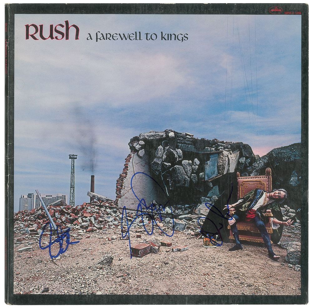 A Farewell to Kings album by Rush, signed on the front cover in blue felt tip by Geddy Lee, Alex Lifeson, and Neil Peart. In fine condition, with poor contrast to Lifeson's signature. The record is not included. Accompanied by a John Brennan Collection letter of provenance.