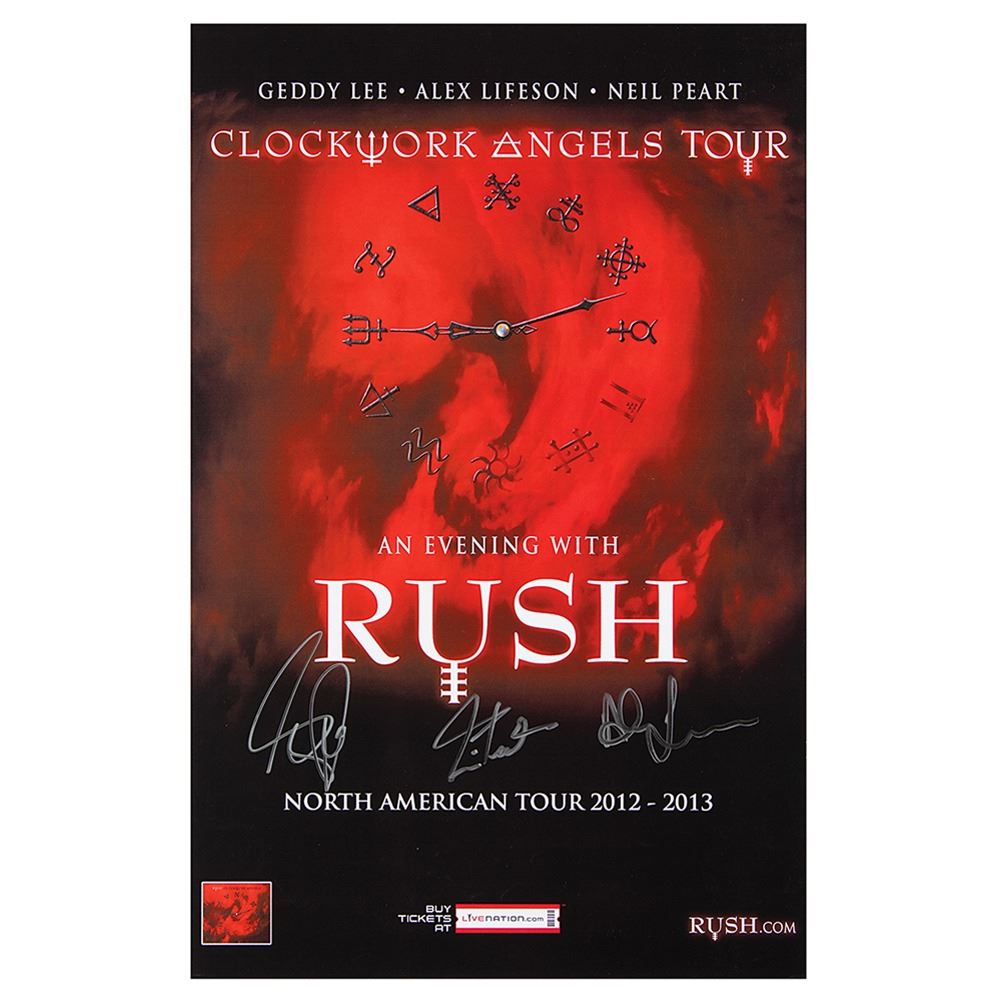 Color 11 x 17 promotional poster for the North American leg of Rush's 2012-2013 Clockwork Angels Tour, signed in silver ink by Neil Peart, Geddy Lee, and Alex Lifeson. In fine condition, with light rippling.